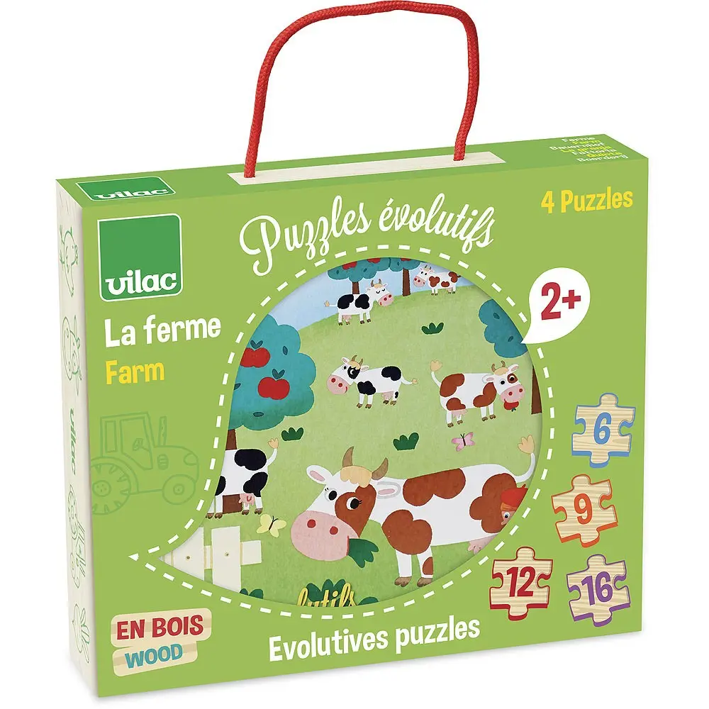 Découvrez les 4 puzzles évolutifs la ferme de Vilac, 4 puzzles en bois à partir de 2 ans avec des puzzles de 6, 9, 12 et 16 pièces sur le thème de la ferme.