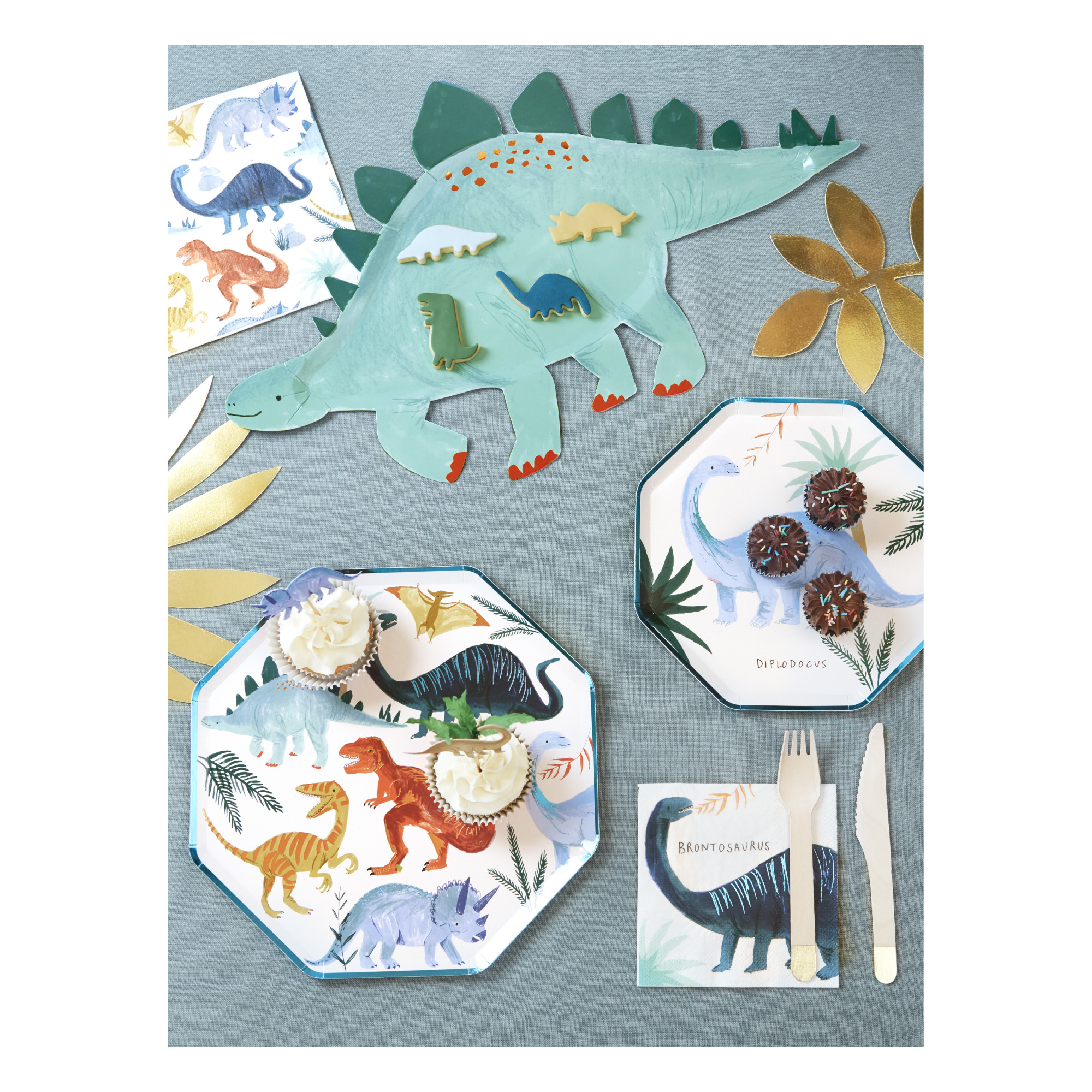 Rendez votre fête de dinosaures encore plus formidable avec ces brillantes assiettes dinosaures. Présentant de belles illustrations de dinosaures célèbres, avec des détails en cuivre et en feuille verte.