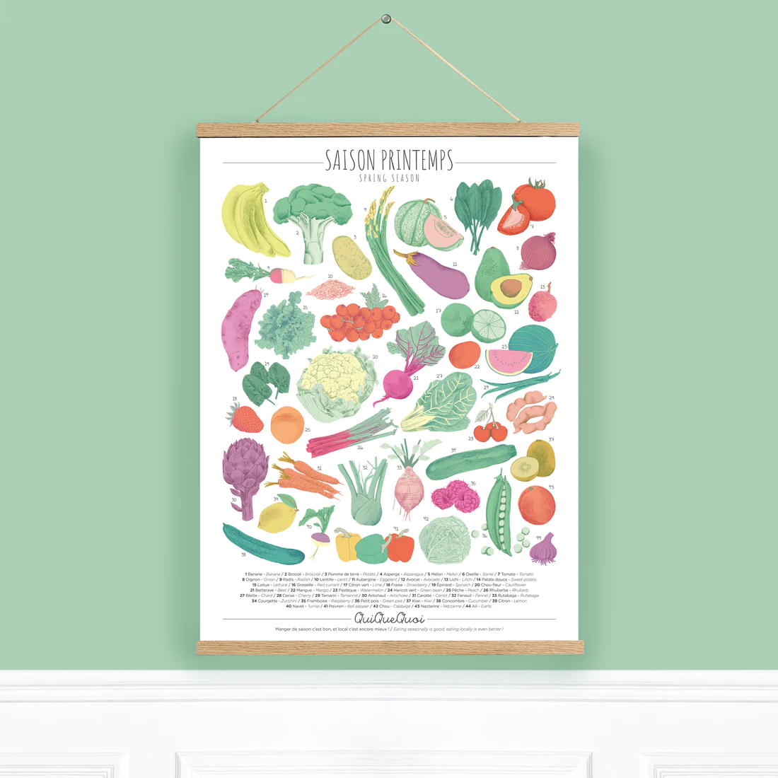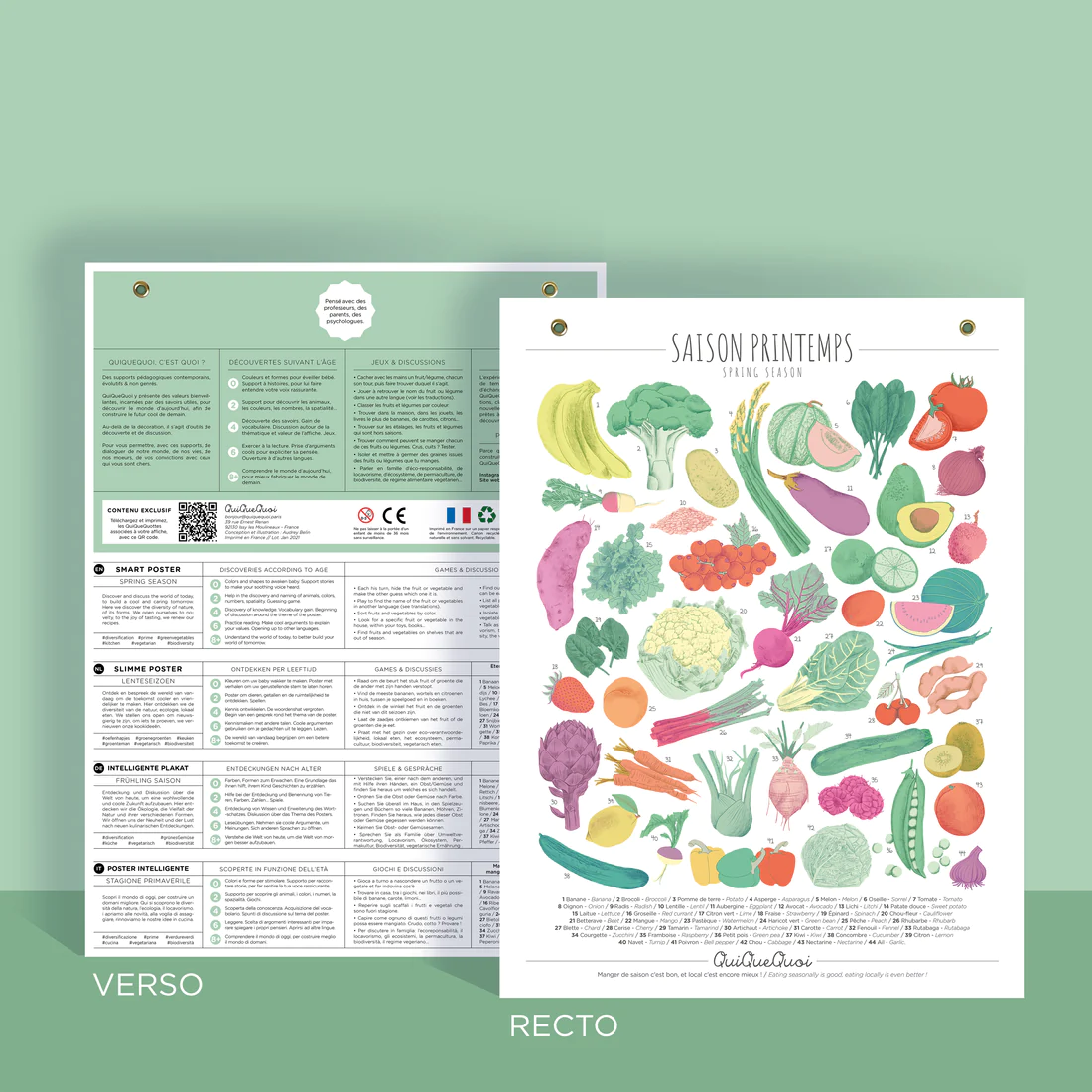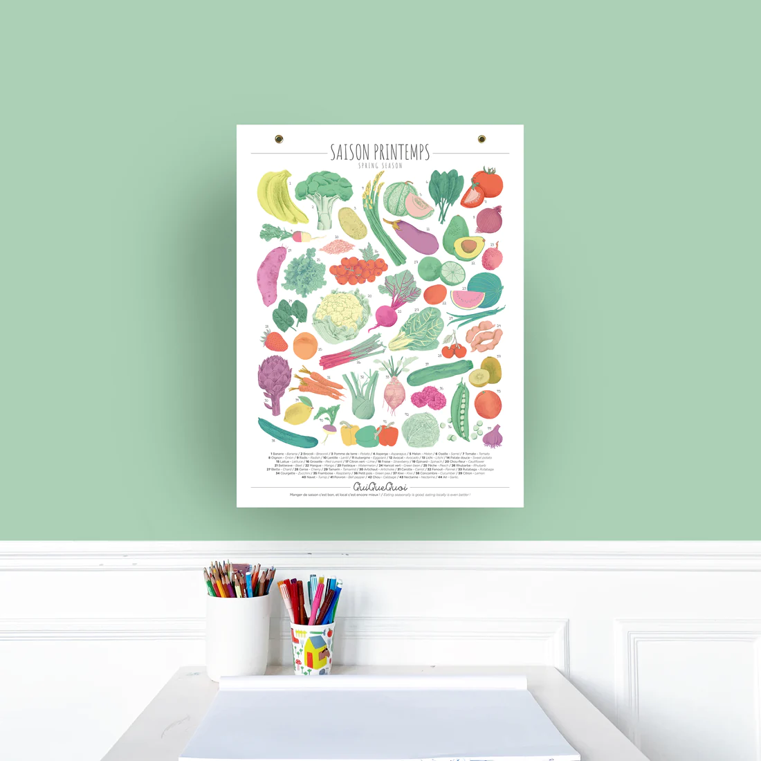 Pour faire découvrir les fruits et légumes de saison à votre enfant. Ici, le printemps, sa diversité des goûts, des couleurs, des formes que la nature propose. Cette affiche educative permet de se familiariser avec les aliments pour susciter l’envie de découvertes ! Conseillée dès la diversification alimentaire, la dme, permettant de voir l’aliment en entier, et un temps d’appropriation hors repas pour vos enfants. Pour réaliser en famille la liste des courses, trouver une idee repas… Challengez vous pour manger de saison et manger local. Brocoli, Rutabaga, Courgette, Epinard, Groseille, Melon, Tamarin… vos enfants vont adorer ça !  »…