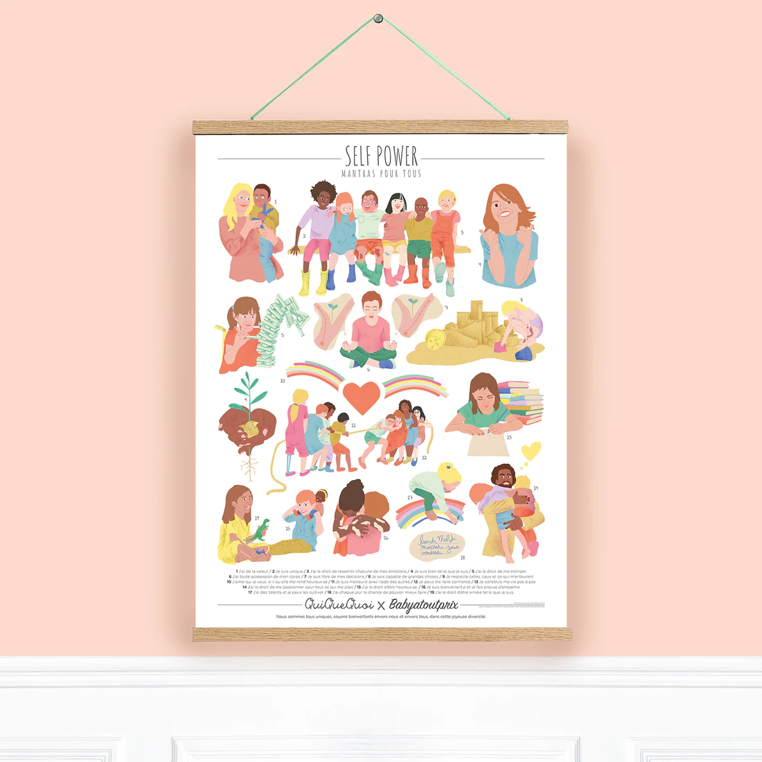 Qui Que Quoi a travaillé autour d’une affiche pour aider les kids à développer des notions fortes et importantes. La confiance, l’empathie, l’entraide, voila un support pour les guider à vivre bien avec eux-mêmes et avec les autres. “ Nous sommes tous uniques, soyons bienveillants envers tous, dans cette joyeuse diversité. ” Parce qu’il est urgent d’offrir l’essentiel à nos enfants, avec cette affiche décorative prônez l’education bienveillante et la pedagogie active. Avec ces mantras, l’enfant intègre et lie ces notions à son quotidien. Cette affiche est pensée pour toute la famille, pour toutes les familles ! Co-conçu avec Cyrielle…