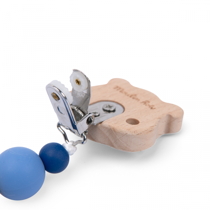 Attache-tétine hamster en bois et silicone pour ne plus perdre la sucette de bébé. Les perles de silicone sont sans danger, il pourra jouer avec et les mâchouiller. A clipser sur les vêtements de bébé.