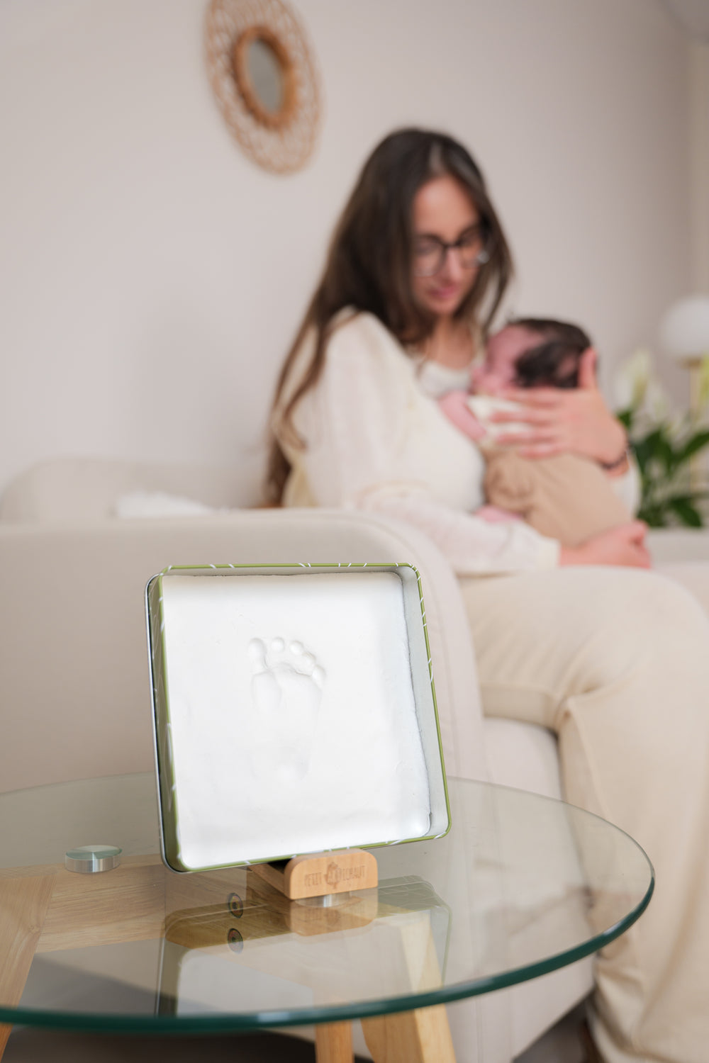 La Baby Box Carrée – Olive Tree est une boîte à empreintes de bébé à utiliser comme cadre grâce à son joli support en bois.
