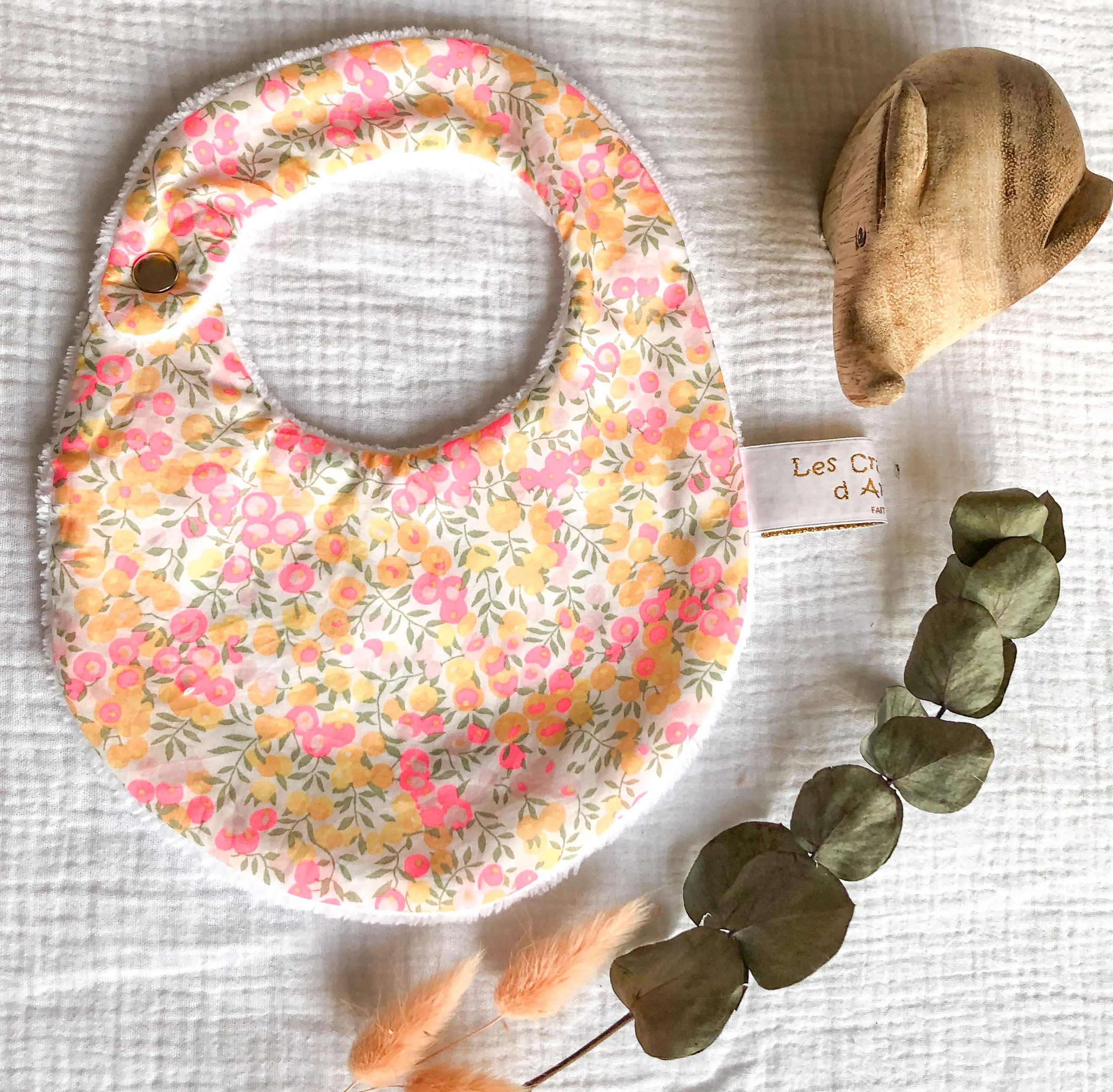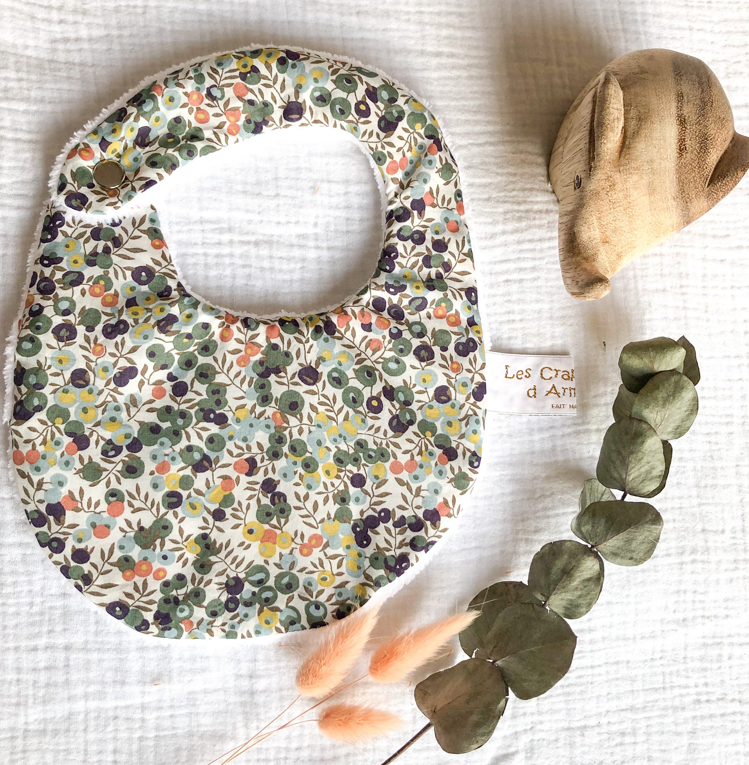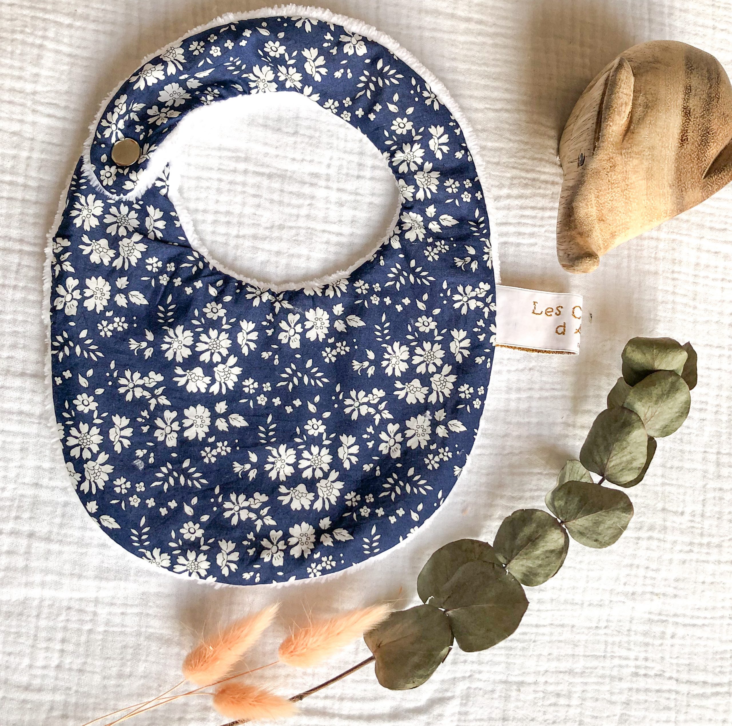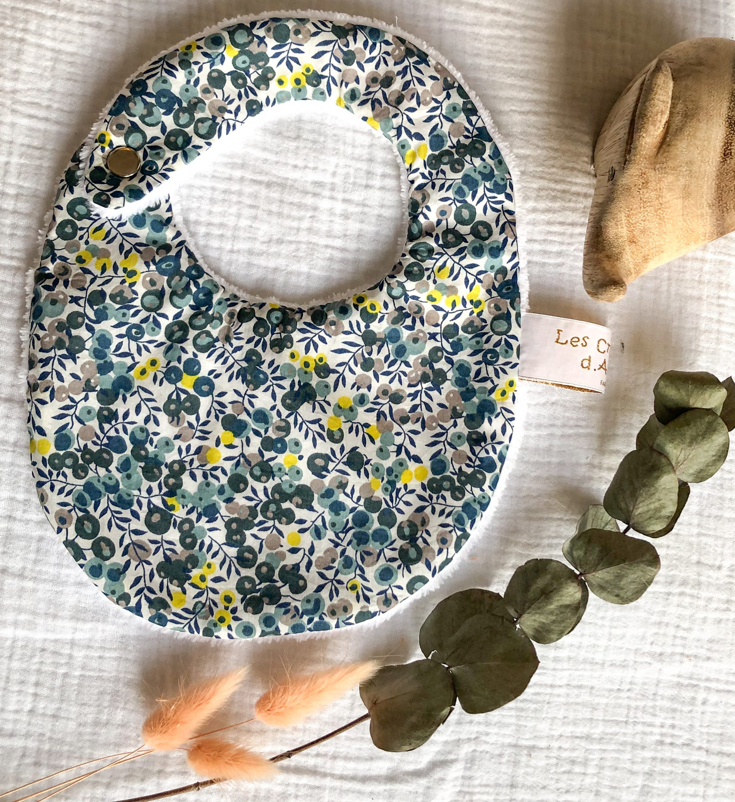 Bavoir pour la naissance à 6 mois. En Tissu Liberty et éponge bambou. L’éponge bambou est réputée pour sa capacité d’absorption, sa durée de vie et sa douceur. Tissu Liberty Tana Lawn: Batiste en pur coton. Eponge bambou OEKO-TEX classe 1: 90 % bambou, 20% polyester. Fermeture par pression métallique. Lavage machine 40°; Pas de repassage, sèche linge possible. Délai de confection 2 à 3 semaines.
