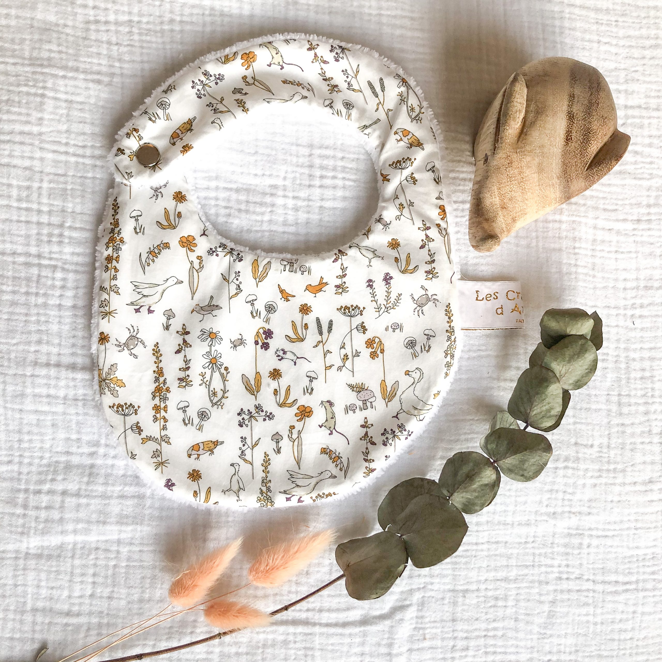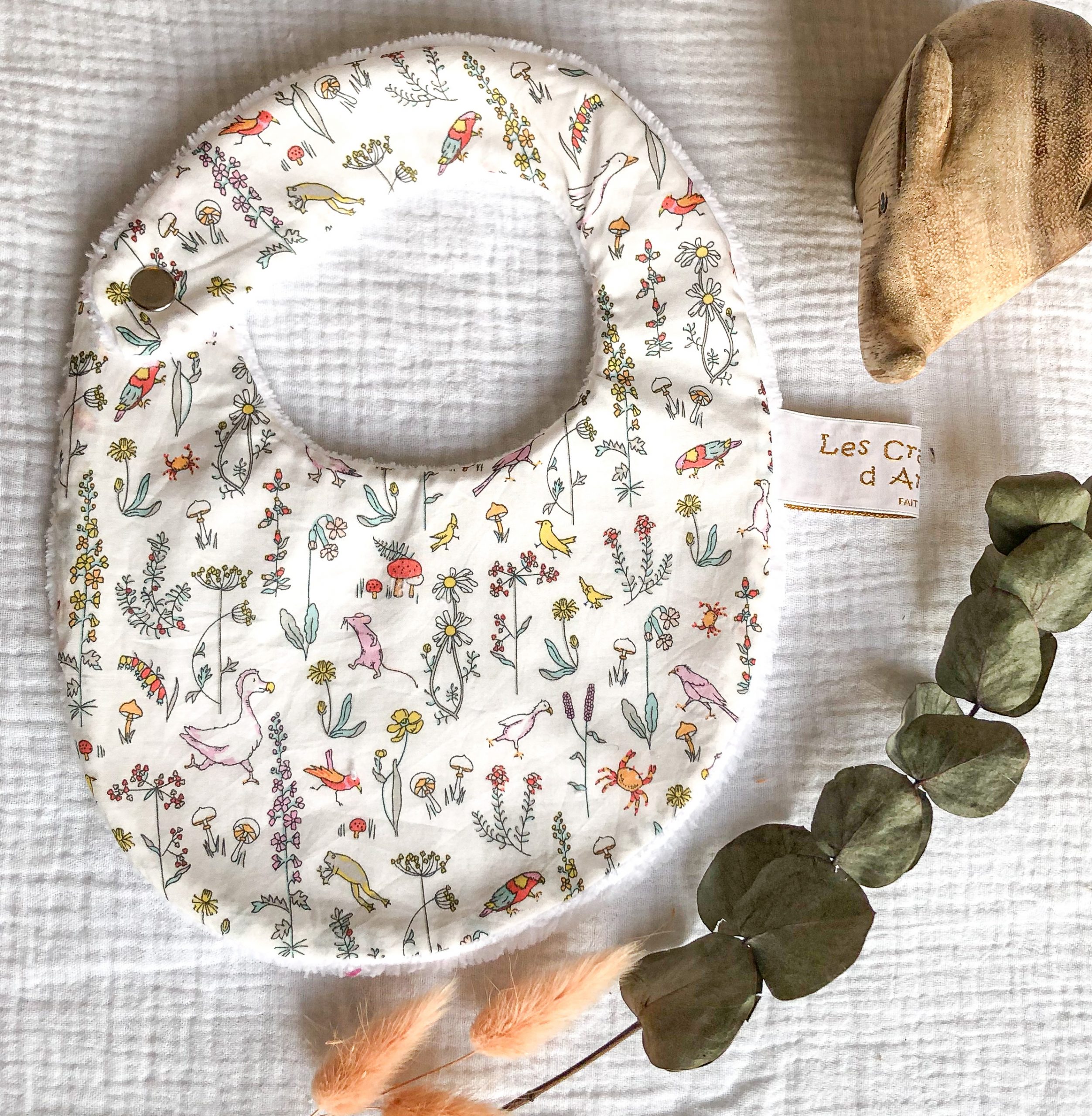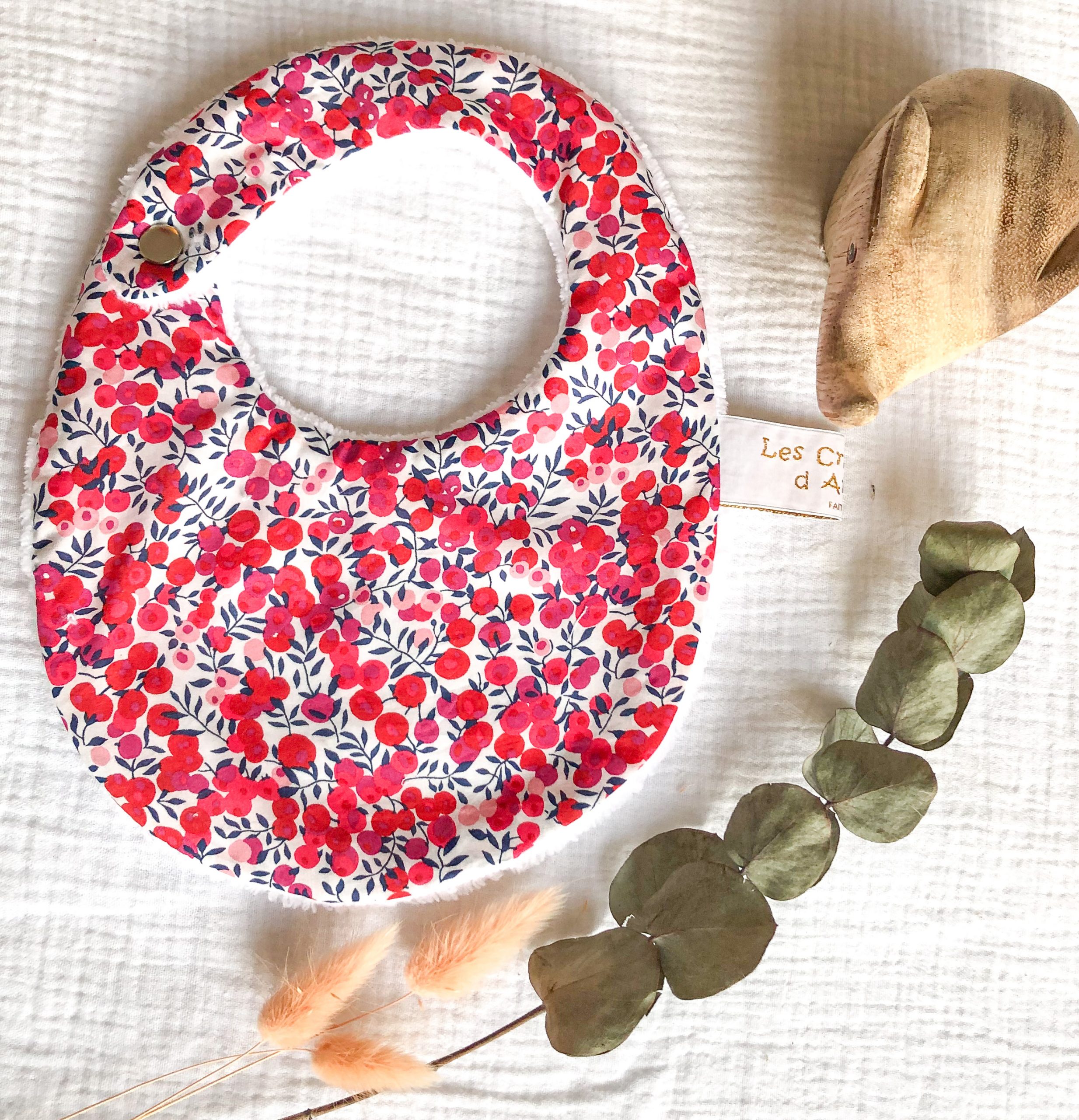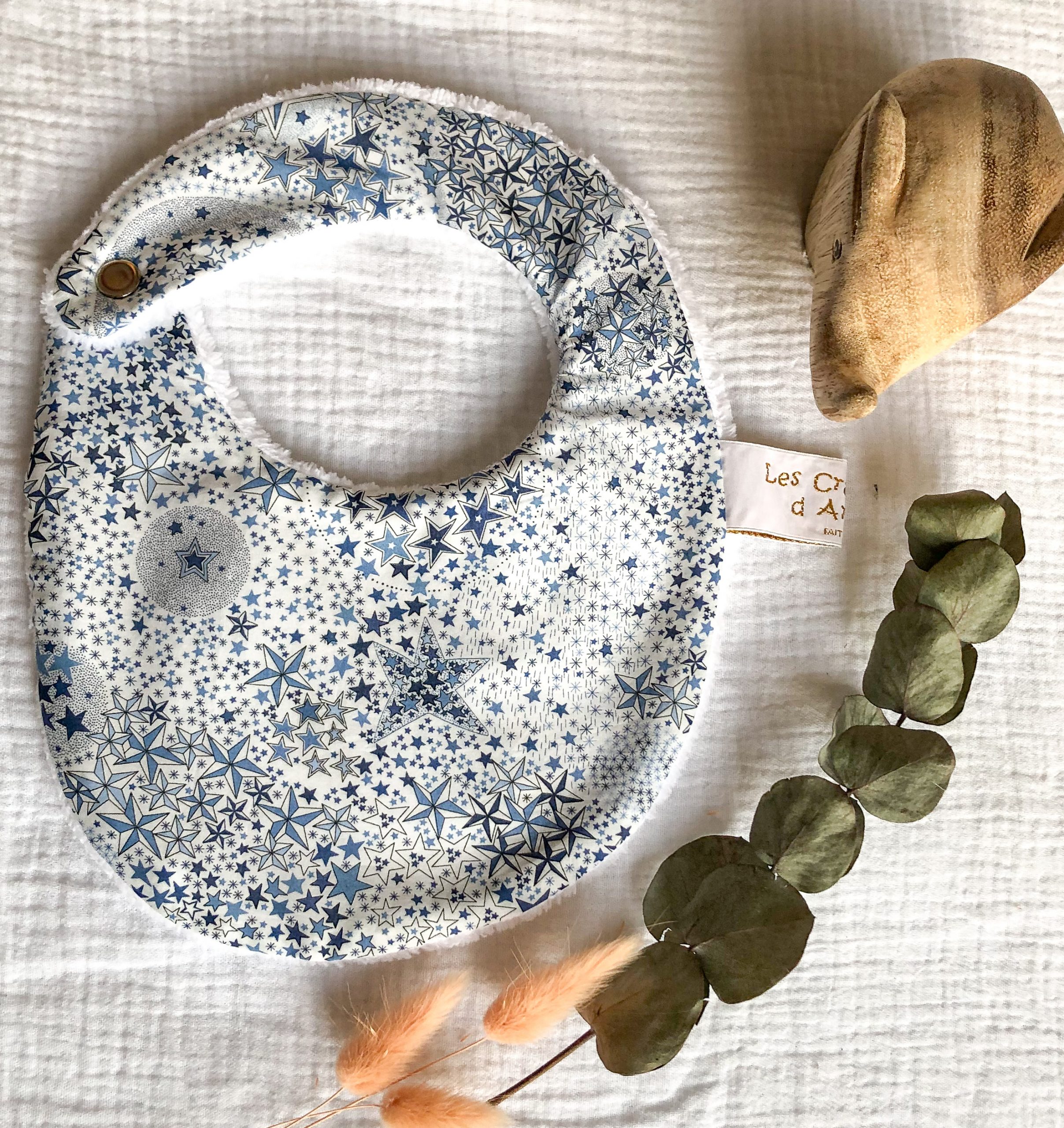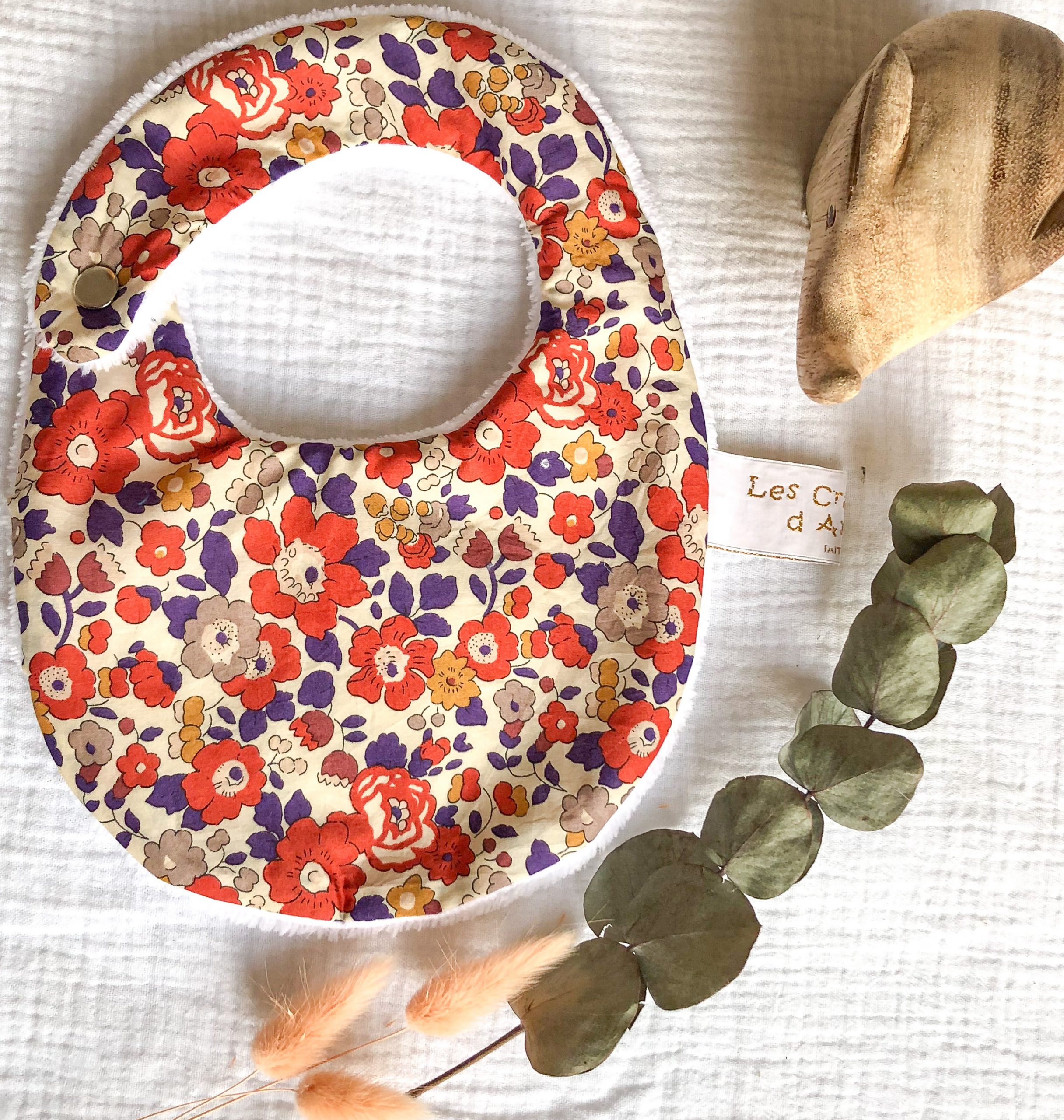 Bavoir pour la naissance à 6 mois. En Tissu Liberty et éponge bambou. L’éponge bambou est réputée pour sa capacité d’absorption, sa durée de vie et sa douceur. Tissu Liberty Tana Lawn: Batiste en pur coton. Eponge bambou OEKO-TEX classe 1: 90 % bambou, 20% polyester. Fermeture par pression métallique. Lavage machine 40°; Pas de repassage, sèche linge possible. Délai de confection 2 à 3 semaines.