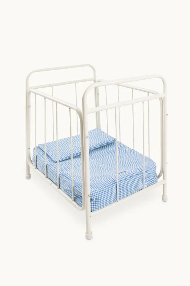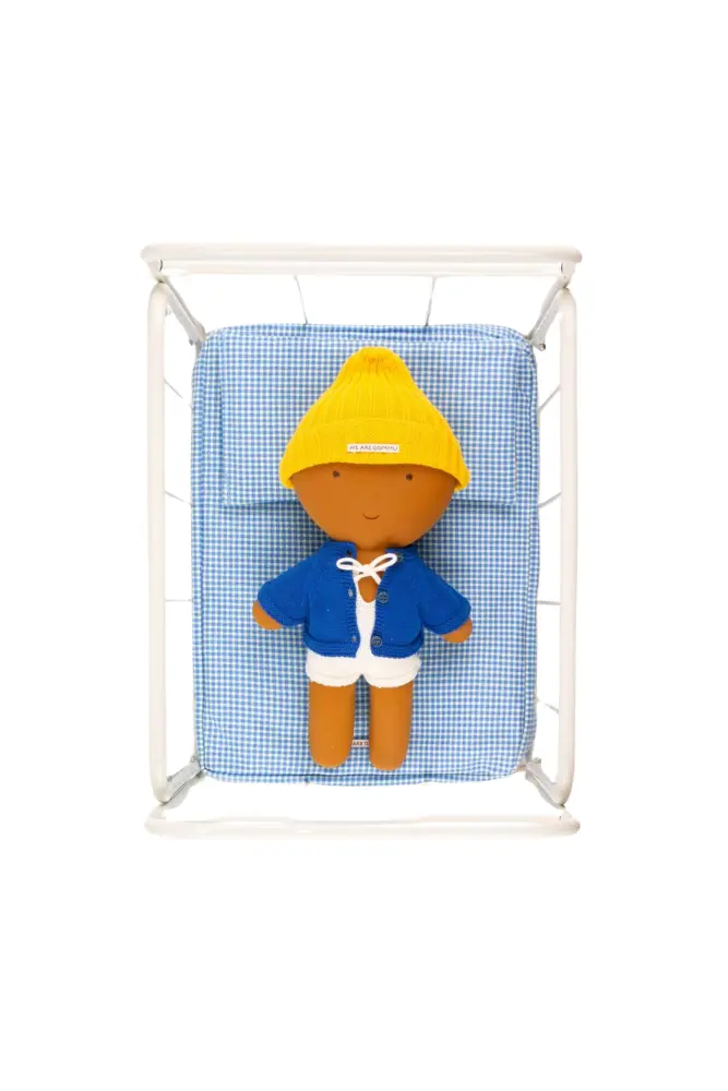 Le joli berceau We are Gommu. Fabriqué en toile 100% coton avec un joli imprimé Vichy bleu et crème. Le berceau comprend 1 matelas et 1 oreiller.