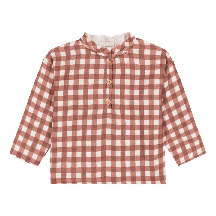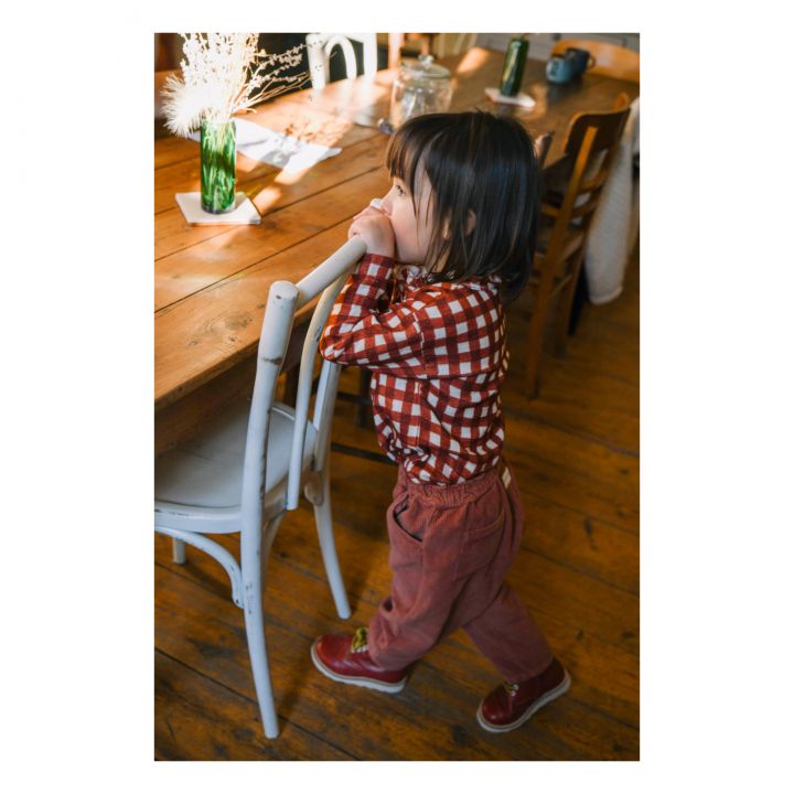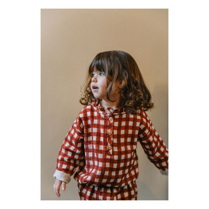 Blouse manches longues mixte en gaze de coton flammé. Ouverture avec boutons en bois sur le devant. Pour les tailles 6M et 12M: boutonnage devant tout du long pour plus de praticité. Fond écru avec imprimé carreaux Vichy de couleur rouille. Conseils taille: prendre une taille de plus que l’âge de votre enfant. Par exemple du 4A pour un enfant de plus de 3 ans.