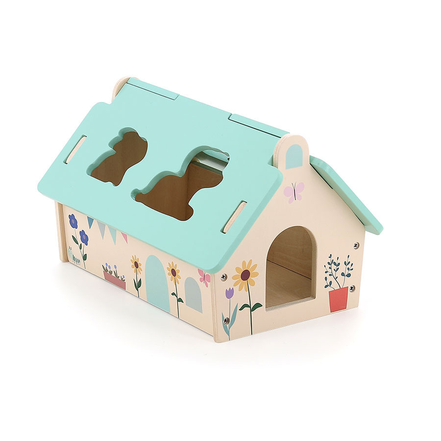 Qui se cache dans notre jolie maison en bois ? Un petit chien ? Oui mais pas seulement ! Il est accompagné par une souris, un chat et un lapin. Cette boîte à forme, dessinée avec tendresse par Sarah Betz-Cubeely va aider votre enfant à développer logique et dextérité. Le petit plus ? Le toit de la maison est amovible, ce qui permet de récupérer les pièces à l’intérieur très facilement.