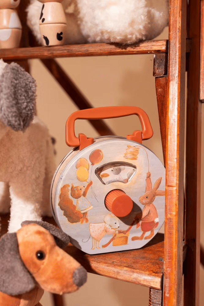 Tournez le bouton et la musique retentit, tandis que les animaux prennent vie. Cette boîte à musique en métal fonctionne sans piles. Elle peut être utilisée pour jouer ou pour aider les petits à s’endormir. Retrouvez le modèle Arche de Noé et Musiciens.