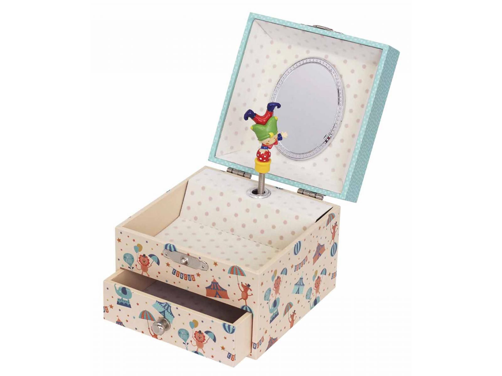 UNE BOÎTE MUSICALE POUR RANGER SES TRESORS : Cette boîte à musique en forme de cube et disposant d’un tiroir émerveillera l’enfant qui y rangera ses trésors. Actionnez la manivelle et la figurine Acrobate s’anime comme par magie au son de la musique !