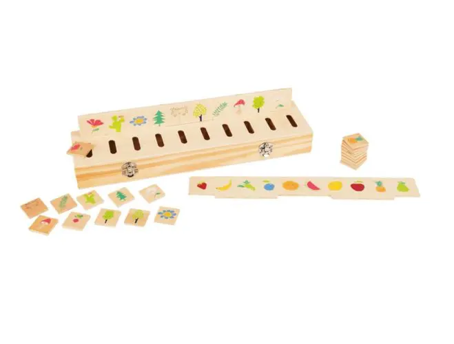 La boîte de tri simple est accompagnée de quatre planches recto-verso colorées avec des motifs d’animaux et de fruits…. Ce qui fait au total 8 familles d’objet à reconnaître et à nommer .