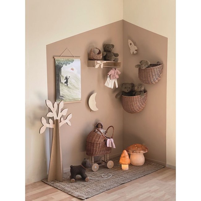 Boite à musique en bois en forme de lune se fixe au mur et viendra joliment décorer une chambre d’enfant. Dimensions 25 x 16 x 4 cm.