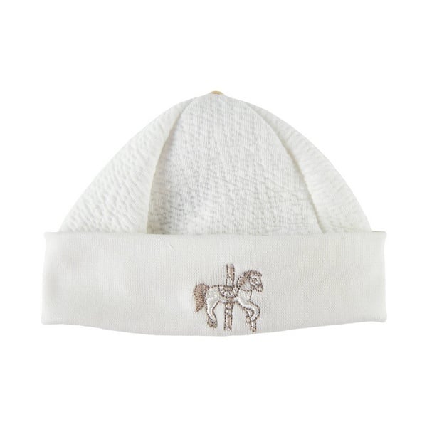 Bonnet pour bébé en jersey gaufré ivoire, brodé cheval. Parfait pour la maternité et les premiers jours de bébé. Taille unique.