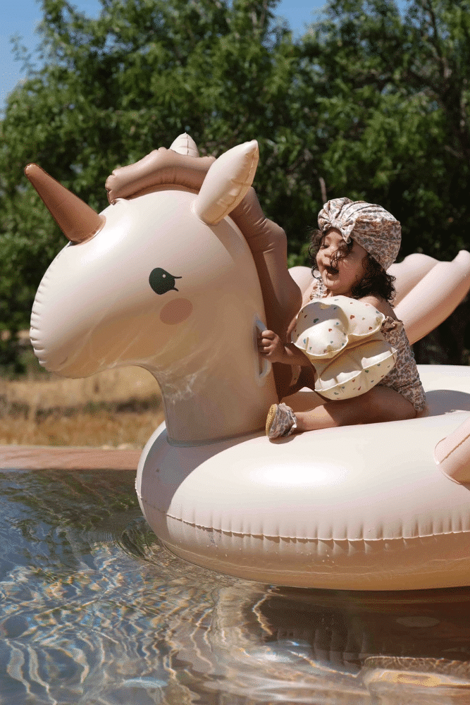 Vous partez en vacances ou passez une journée au bord de l’eau ? Alors emportez ce joli matelas gonflable en forme de licorne avec vous et le plaisir peut commencer. Pour les enfants qui ne savent pas encore nager, l’utilisation de ce petit matelas gonflable nécessite le port de brassards et la surveillance d’un adulte.