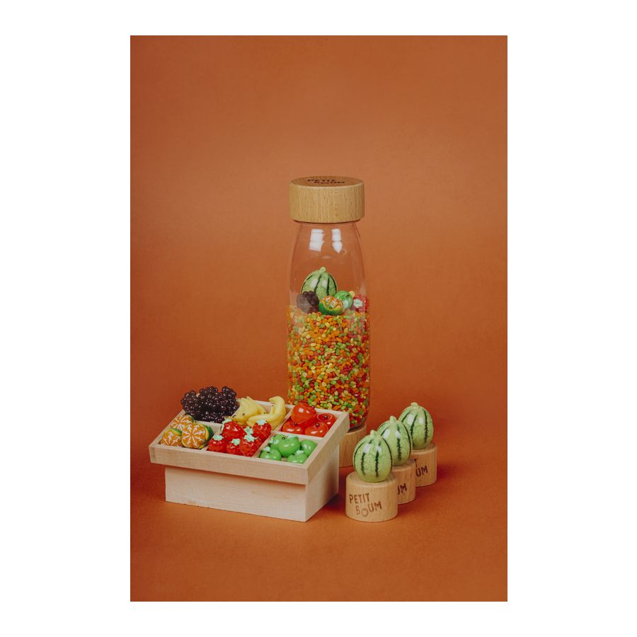 Dites nous quel est votre fruit préféré avec Petit Boum. Retrouvez dans cette bouteille sensorielle Fruits raisin, banane, fraise… On cherche les fruits, on les observe, on les compte… Elle stimulera l’éveil et les sens tels que la vue, le toucher, l’ouïe ou encore la curiosité de vos minis.