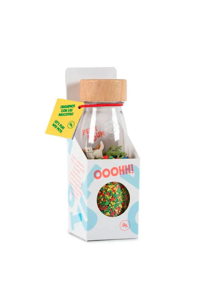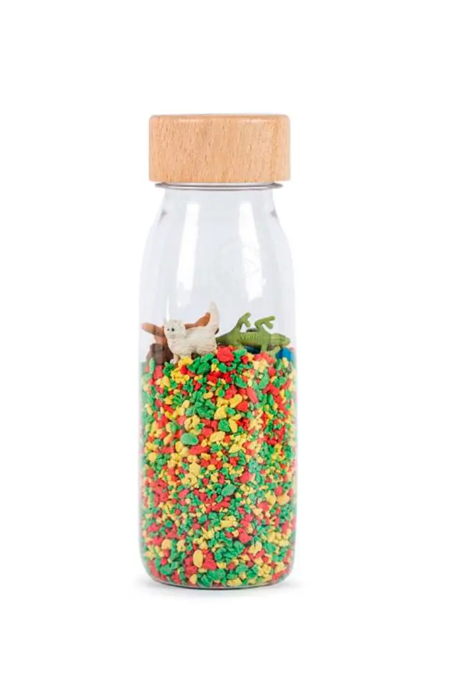 La bouteille sensorielle Spy Animaux qui émerveillera votre enfant dès 3 mois, une jolie activité d’éveil pour observer, écouter et agiter. De jolies couleurs et de belles lumières pour développer les sens des petits curieux. Les bouteilles sont un véritable spectacle pour les plus petits, elles stimulent l’audition particulièrement important pour la première année de la vie de bébé et également l’identification visuelle. Ces bouteilles s’inspirent de la pédagogie Montessori.
