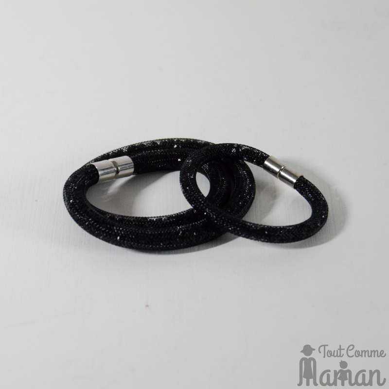 Très actuel, ce bracelet sera parfait pour accessoiriser un look mère fille. Couleur noire. Fermoir aimanté. Bracelet double tour pour maman. Existe aussi en blanc, rose et bleu.