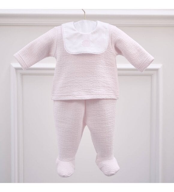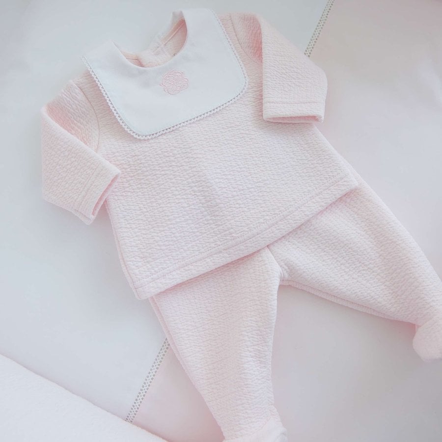 Habillez votre enfant en toute élégance avec cette brassière en jersey gaufré rose + plastron et sa culotte botte. Ornée d’une délicate broderie Théophile & Patachou.