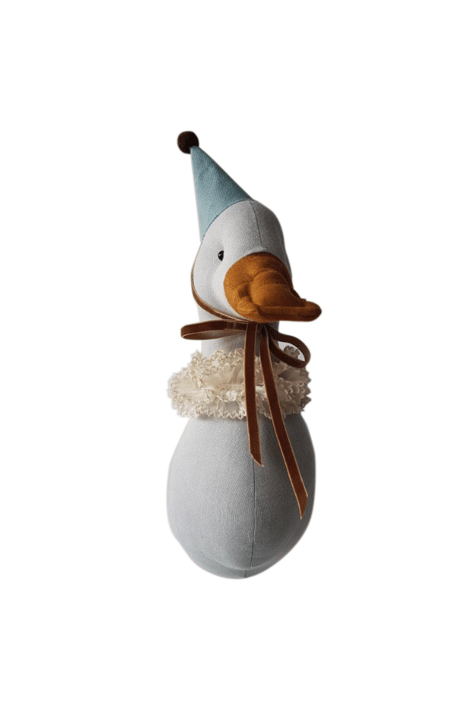 Le canard avec son chapeau de cirque trouvera à coup sûr place dans la chambre de votre enfant ! Réalisé à la main avec un lin de haute qualité.