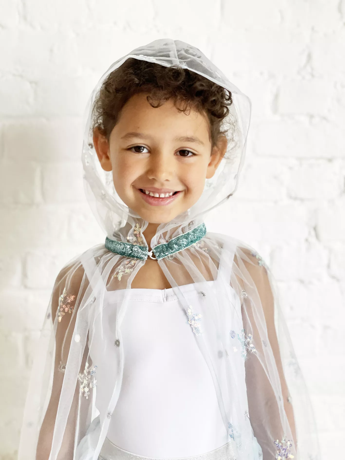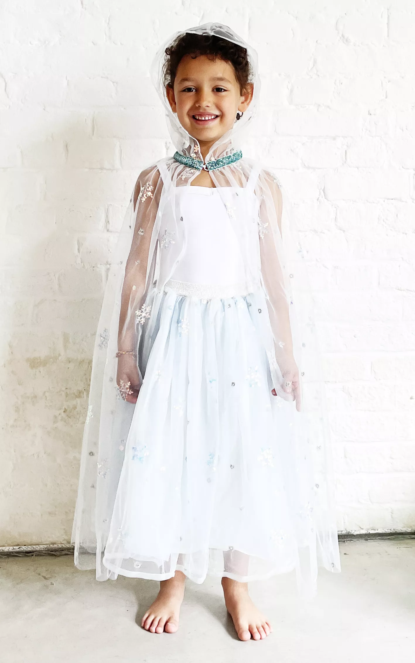 La cape princesse des glaces, c’est une escale au pôle Nord assurée ! Un indispensable de la malle à déguisements! La cape princesse des glaces est en tulle bleu irisé, elle est brodée de sequins étoiles.