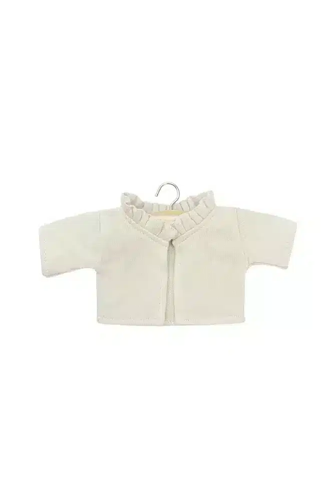 Le cardigan en molleton avec son joli col à volant pour garder sa poupée bien au chaud !