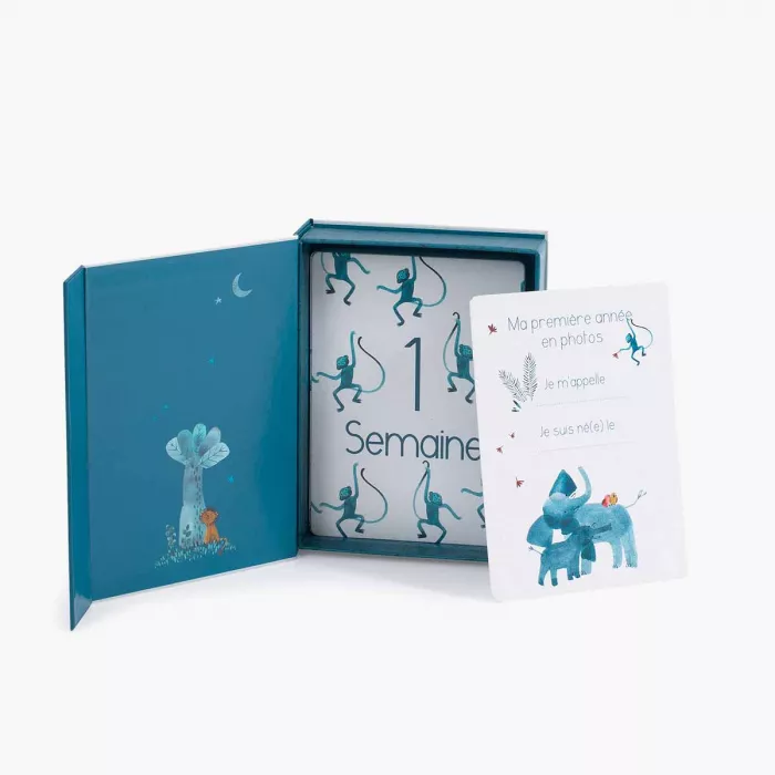 30 cartes pour prendre en photo bébé, et retracer les grandes étapes de ses 12 premiers mois. A chaque fois, un côté thématique illustré avec les animaux de Sous mon baobab, et l’autre côté pour coller la photo et conserver ces beaux souvenirs…