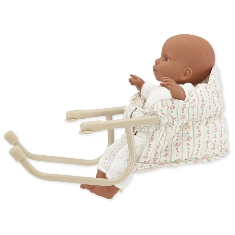 Siège de table pour poupée en coton matelassé, elle dispose d’un cadre en fer mobile. Se fixe facilement sur une table.