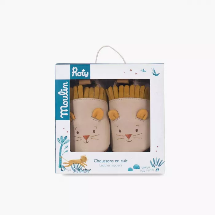Chaussons en cuir avec fermeture élastiquée, brodés d’une tête de lion avec sa crinière jaune soleil.