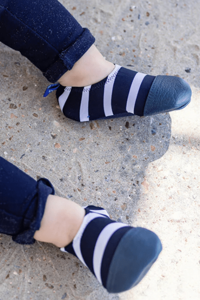 Découvrez les chaussons souples, confectionnés dans les Hauts de France. Semelle fine, les chaussons seront parfaits pour l’intérieur comme l’extérieur sur des sols tels que le sable, le jardin ou l’eau. Avec leur superbe couleur bleu marine et blanc, nos enfants ressentiront toutes les sensations du sol. Antidérapants, ils limitent les glissades sur surfaces sèches comme humides.