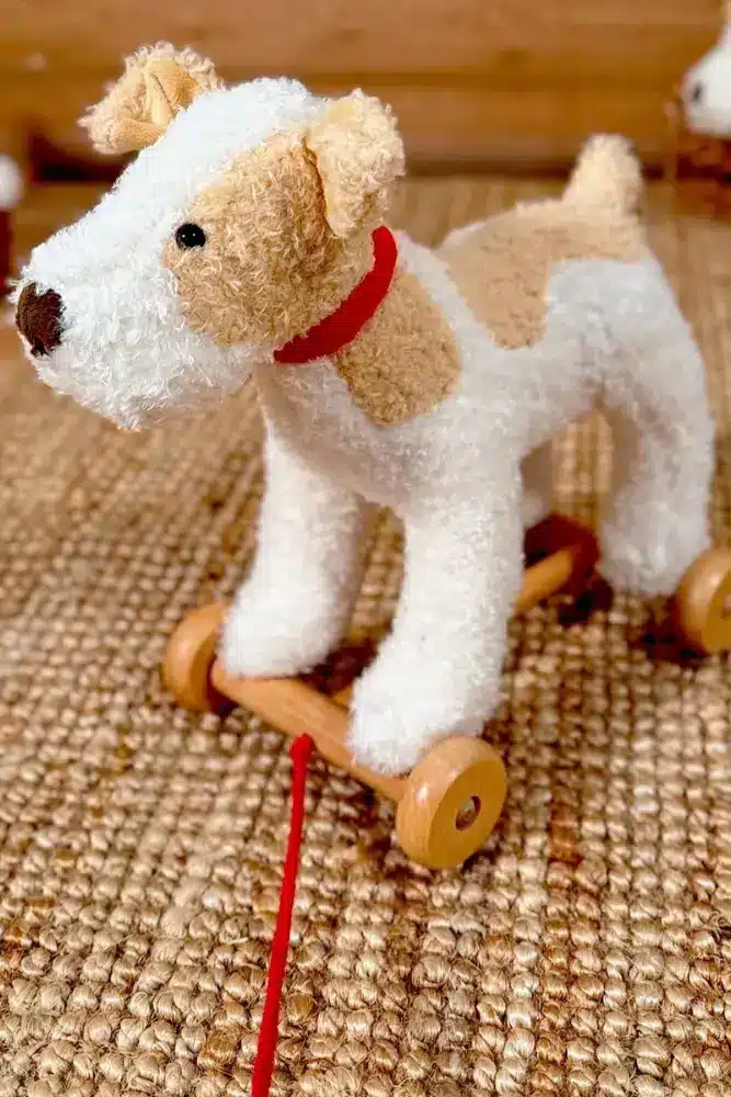 Et voici Eliot le chien sur ses petites roulettes en bois ! Cet adorable chien en peluche est prêt à suivre son petit maître partout. Avec son look vintage et un poil très très doux pour les gros calins, les enfants l’adorent.