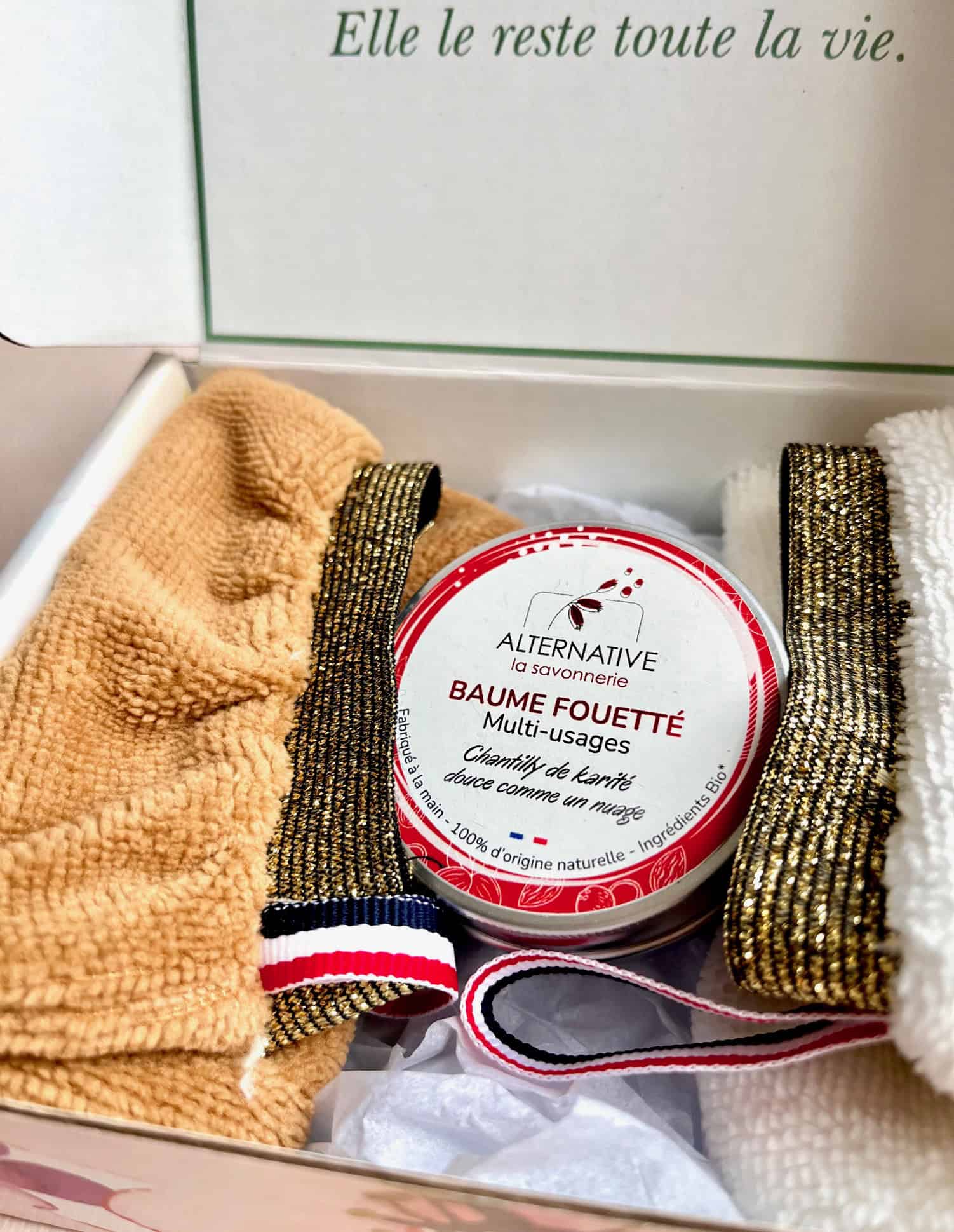 Un coffret cadeau soin et bien-ĂȘtre made in France pour chouchouter une maman : baume fouettĂ© naturel, gants tout doux et jolie boĂźte Ă message.