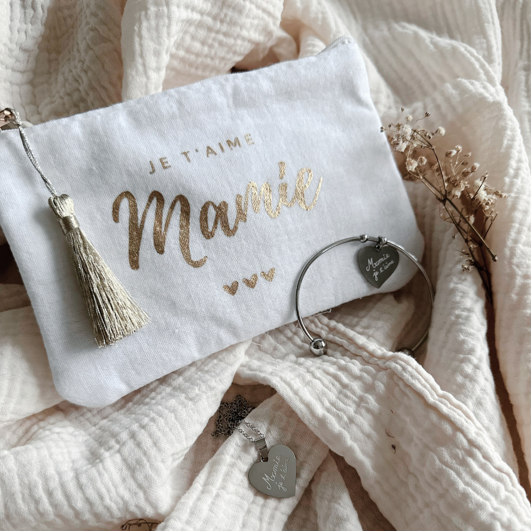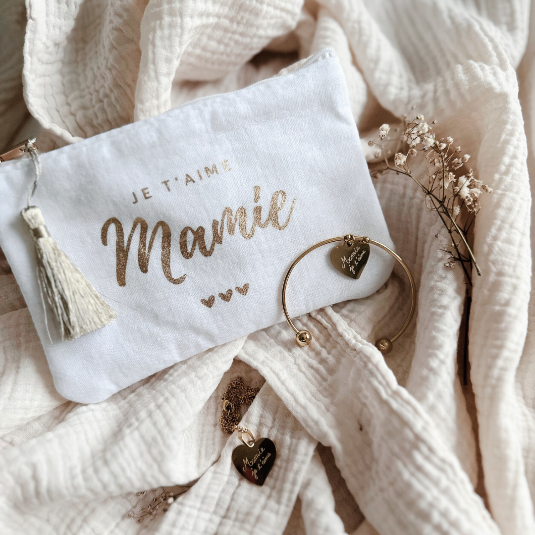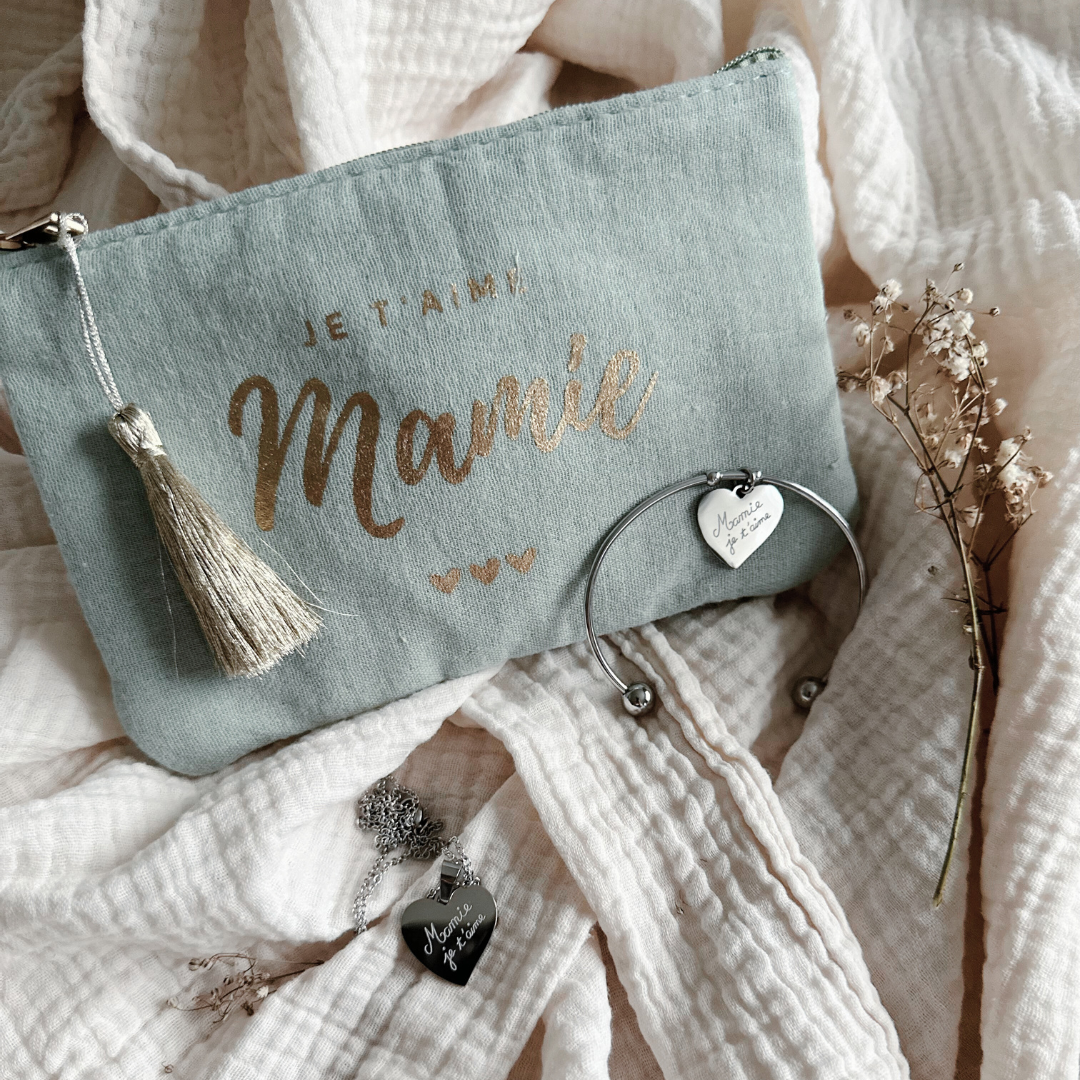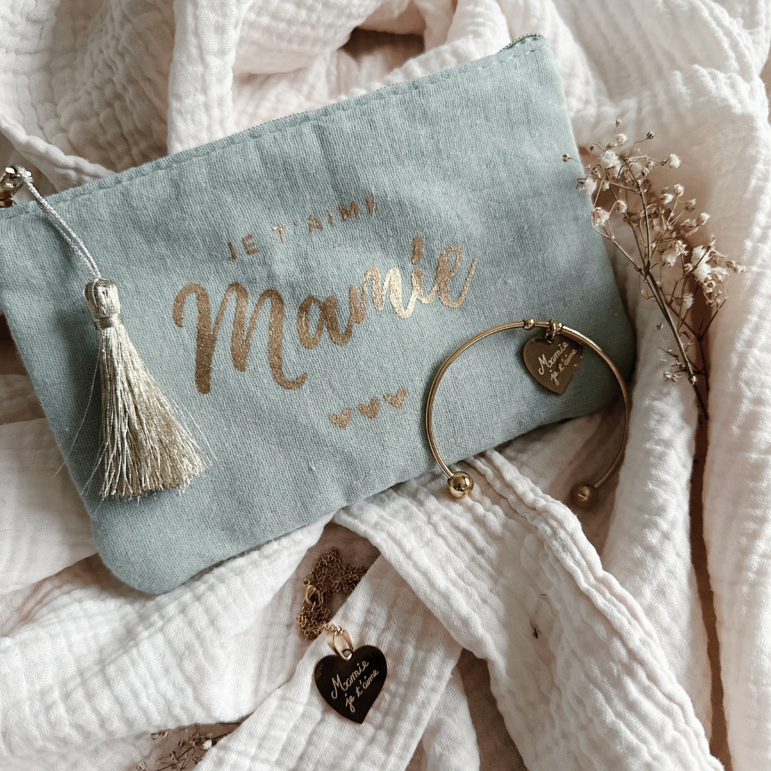 Coffret pochette gaze de coton avec ça trousse en gaze de coton « Mamie je t’aime » Choisissez votre pochette parmi nos 2 modèles différents et votre couleur de bijoux. Personnalisez votre coffret pour un cadeau simple et efficace pour une mamie exceptionnelle ! Un cadeau pour la fête des mamies ou un anniversaire.