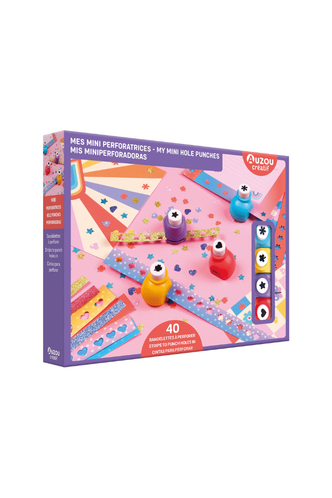Un coffrret qui contient 4 minis perforatrices permettant à votre enfant de décorer les 4 cartes, avec 40 bandelettes pailletés et colorées. Il peut perforer, coller, décorer et laisser s’exprimer sa créativité !