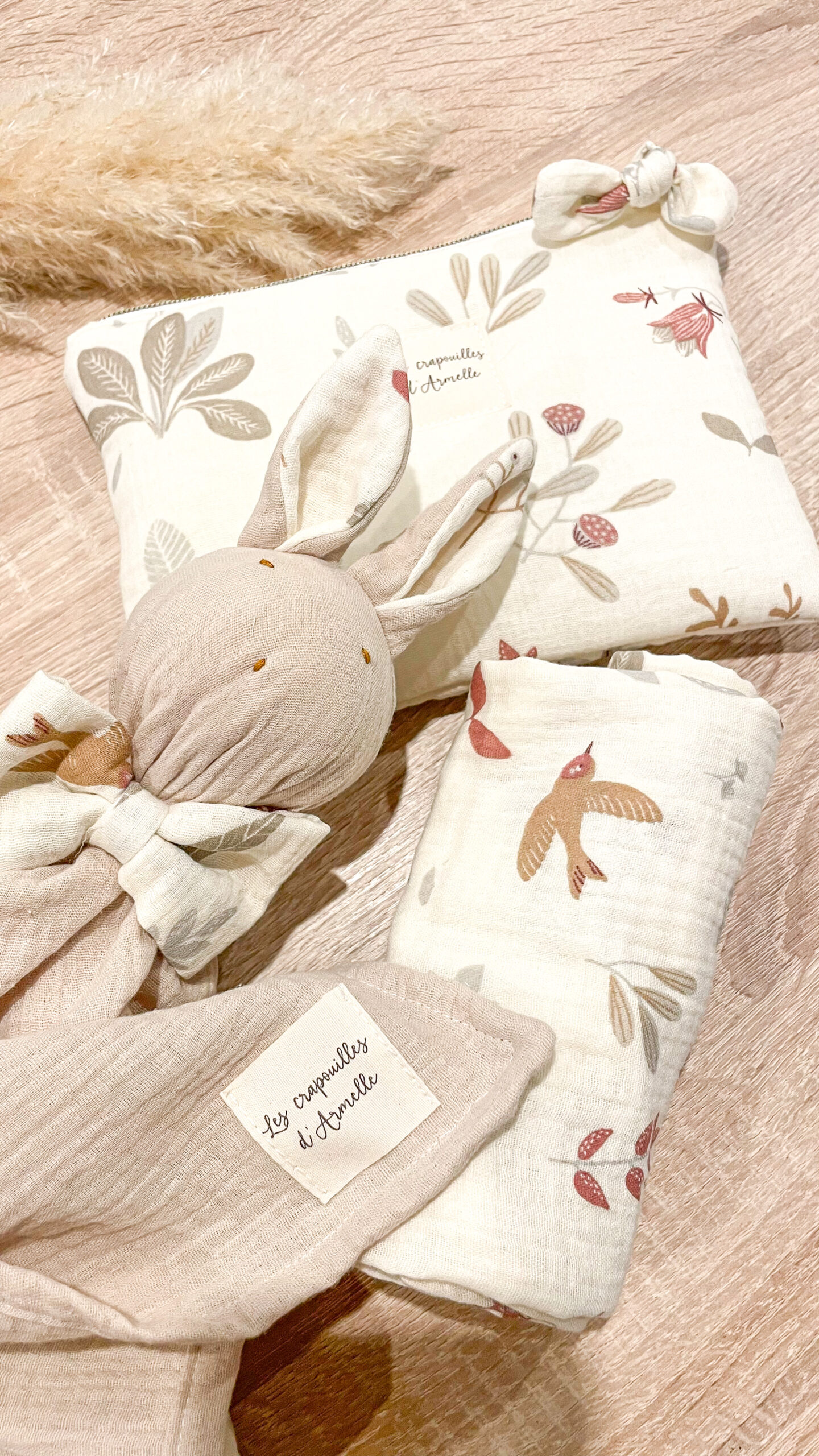 Incroyable coffret de naissance composé d’un doudou lapin certifié aux normes CE, une pochette plate et d’un lange 70/70 OFFERT. le tout composé en double gaze de coton 100% coton OEKOTEX. Idéale pour offrir pour une naissance car tout prêt soigneusement emballé par mes soins dans une jolie boite. Le cadeau de naissance parfait, vous pouvez aussi le mettre sur votre liste de naissance. A personnaliser avec un choix de tissus chics et doux. Composition: Double gaze de coton 100% coton, OEKOTEX Dimensions: pochette 25/17, doudou 40 cm, lange 70/70 cm Entretien: lavable en machine à 30°, repassage doux, pas…