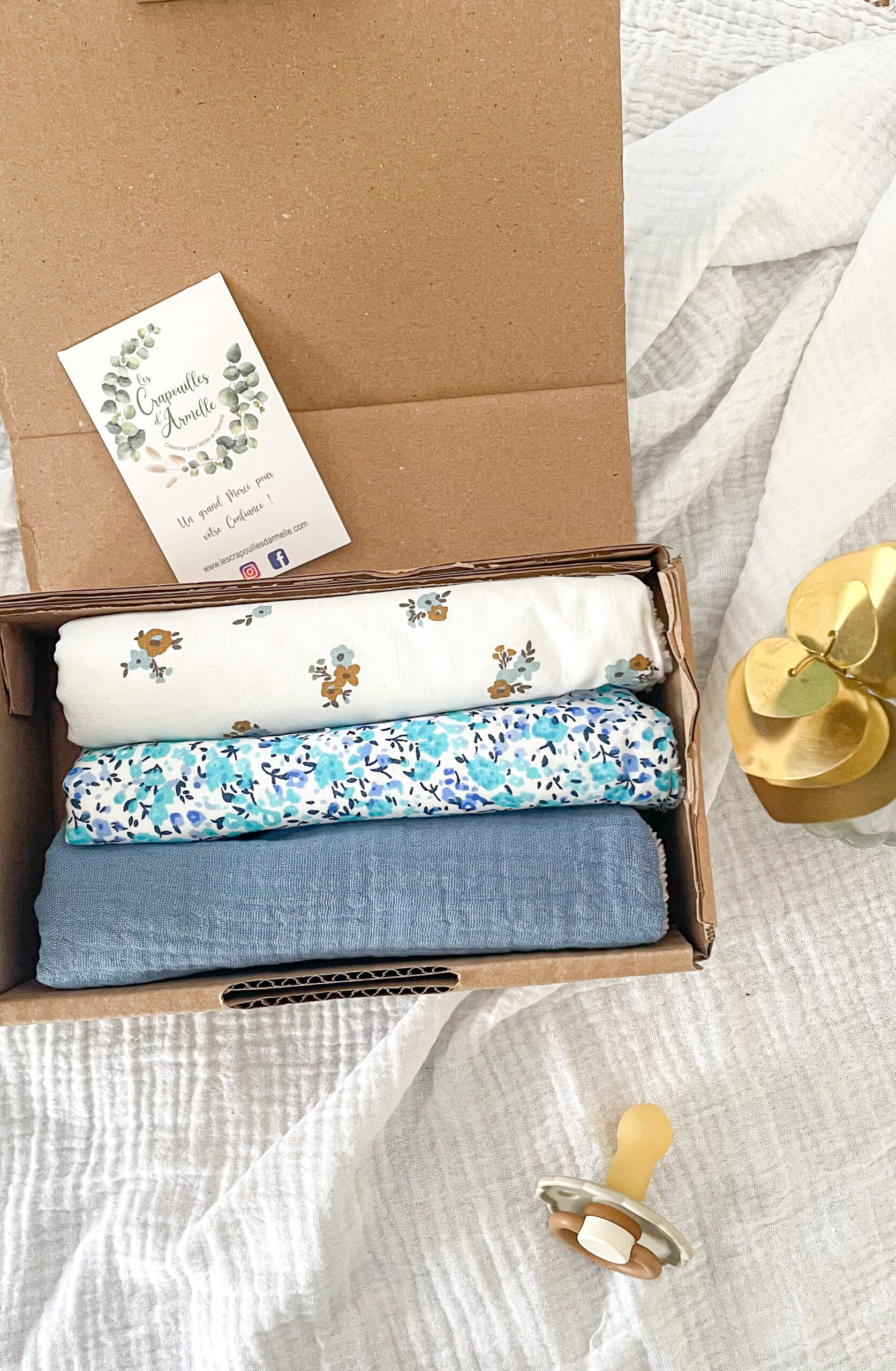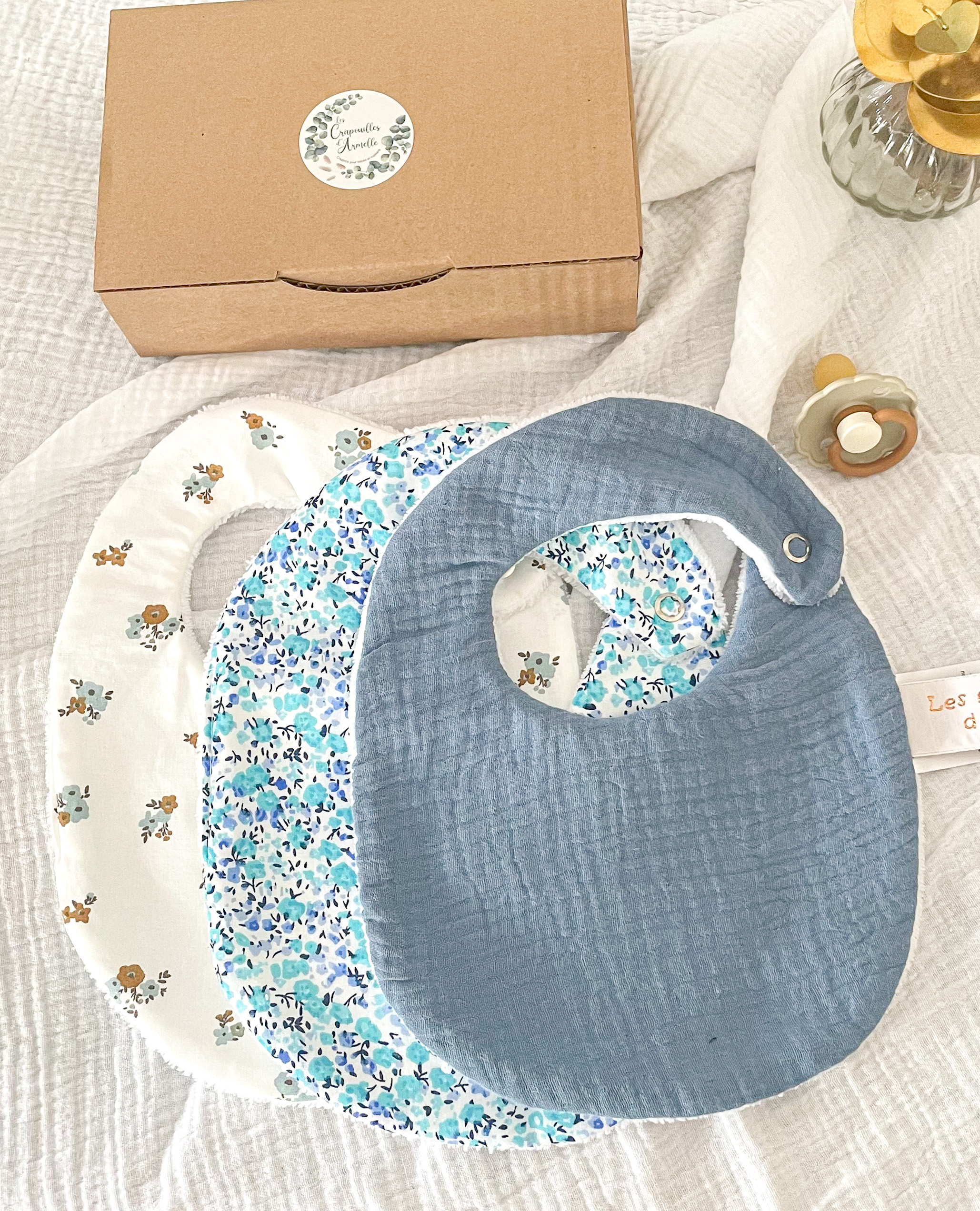 Coffret naissance , trio de bavoirs .