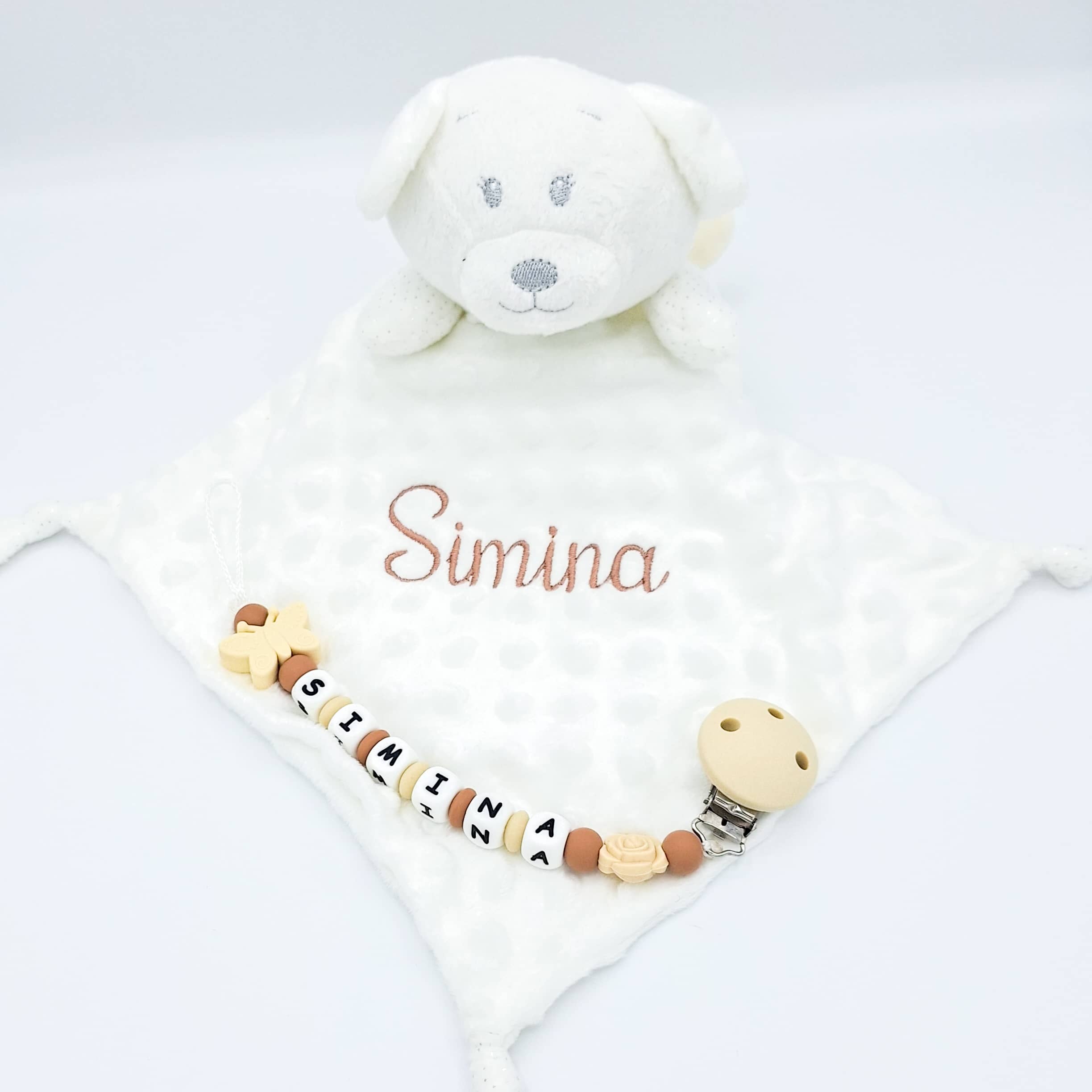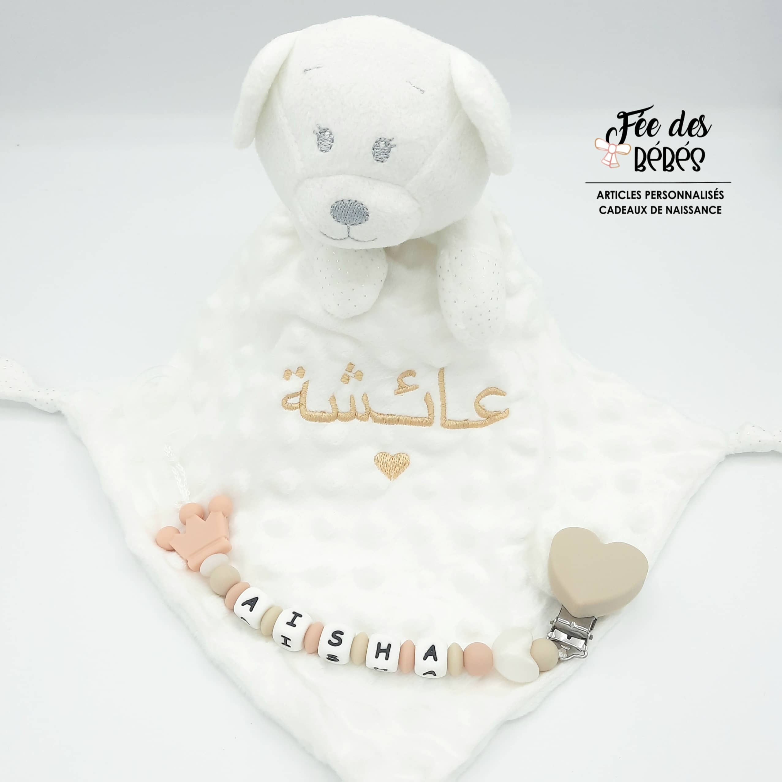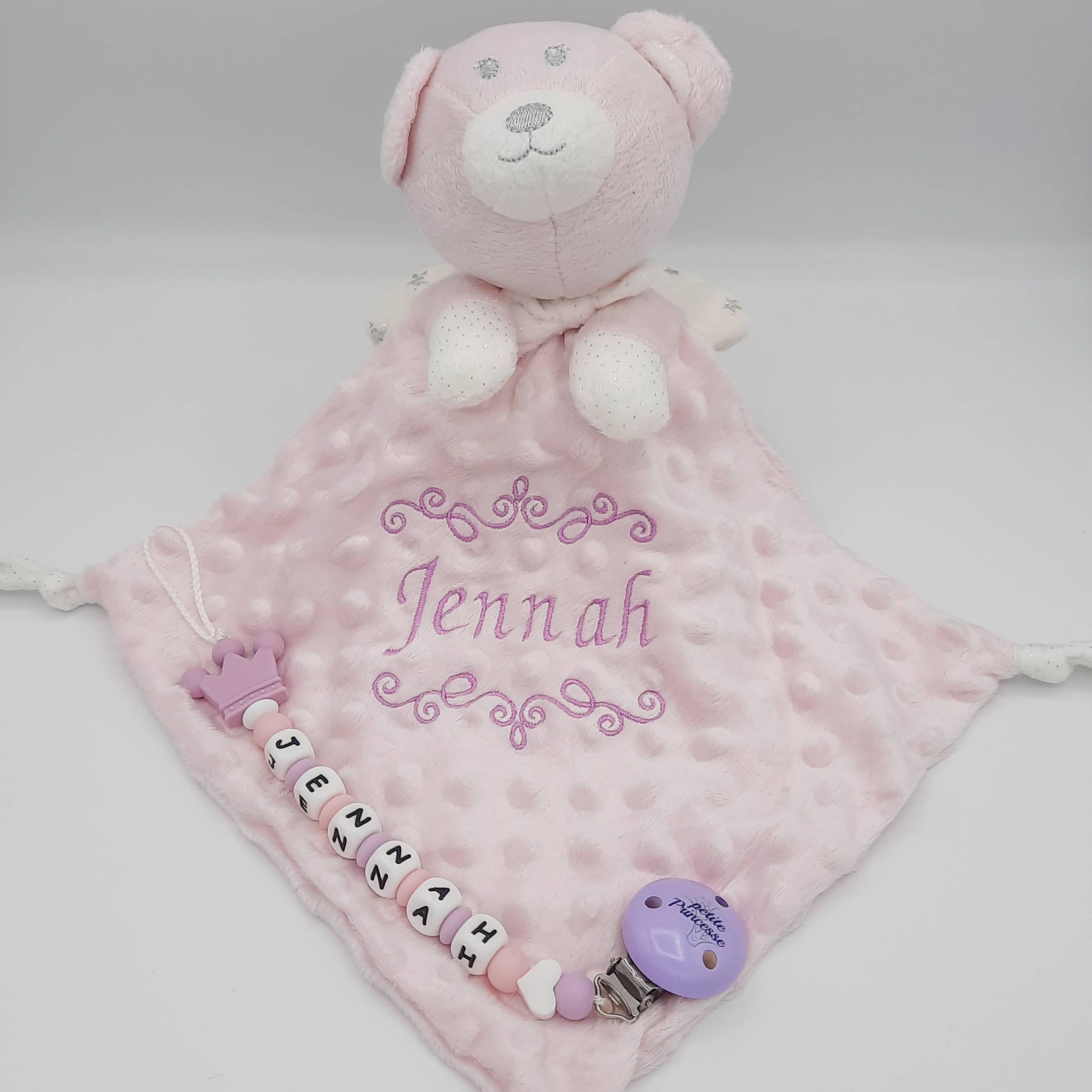 Toucher très doux, 100% polyester Attache tétine personnalisée en silicone alimentaire 🪡 Le motif sera brodé de la même couleur que le prénom. Photos non contractuelles : les couleurs peuvent être légèrement différentes selon les arrivages et le réglage de votre moniteur. Sauf indication contraire, le prénom sera brodé au centre. L’attache tétine sera confectionnée de manière aléatoire, mais sera toujours assortie au doudou.