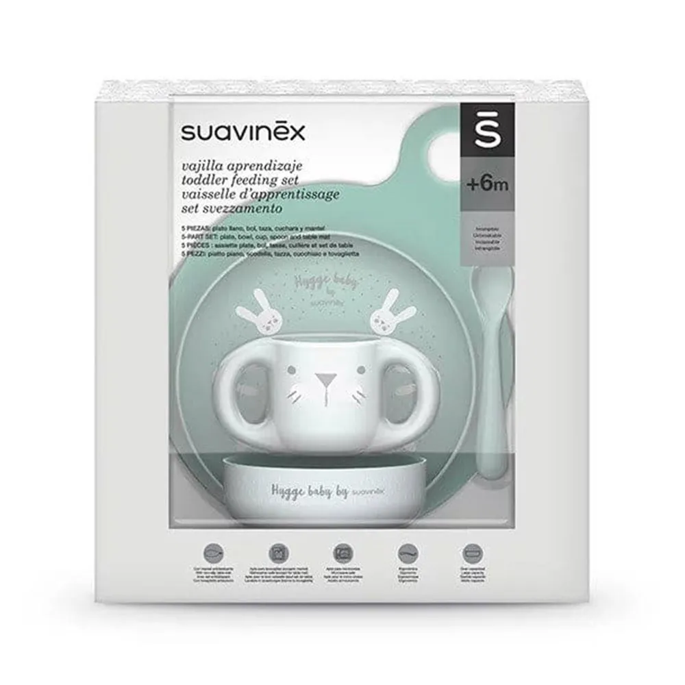 Pour accompagner la diversification alimentaire de bébé, le Coffret Repas 5 Pièces Suavinex offre assiette, bol, tasse, cuillère et set antidérapant.
