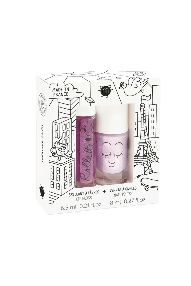 Un joli coffret de la marque Nailmatic pour un cadeau glam-kids ! Comprend un vernis rose nacré Elliot et un brillant à lèvres Rollette à la mure.