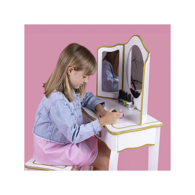 Âge recommandé : À partir de 3 ans Matériau : Bois laqué blanc Dimensions : 98 cm (H) x 30 cm (L) x 60 cm (P) Idéale pour ranger bijoux et accessoires, cette coiffeuse deviendra le compagnon parfait pour leur rituel de beauté.