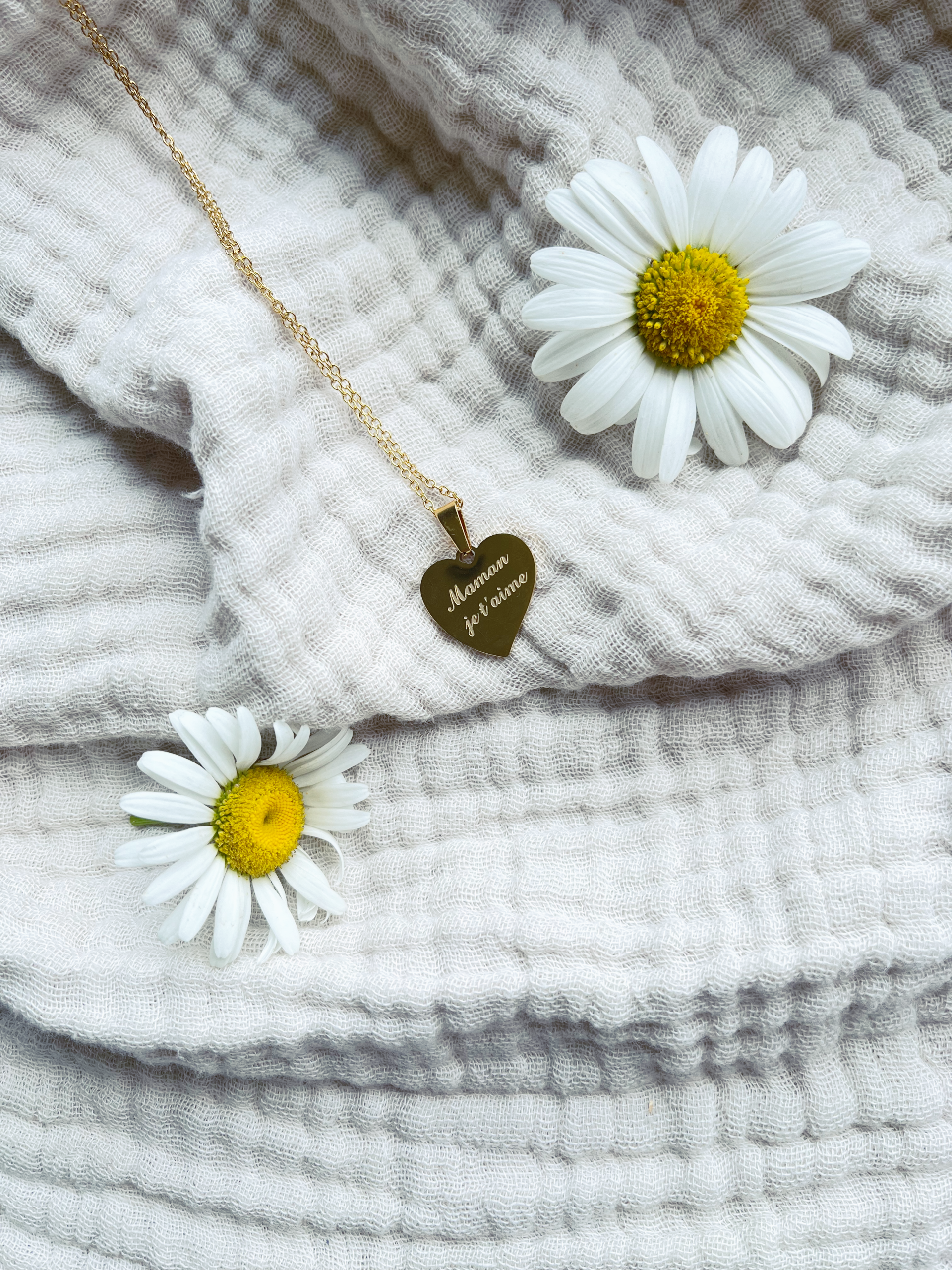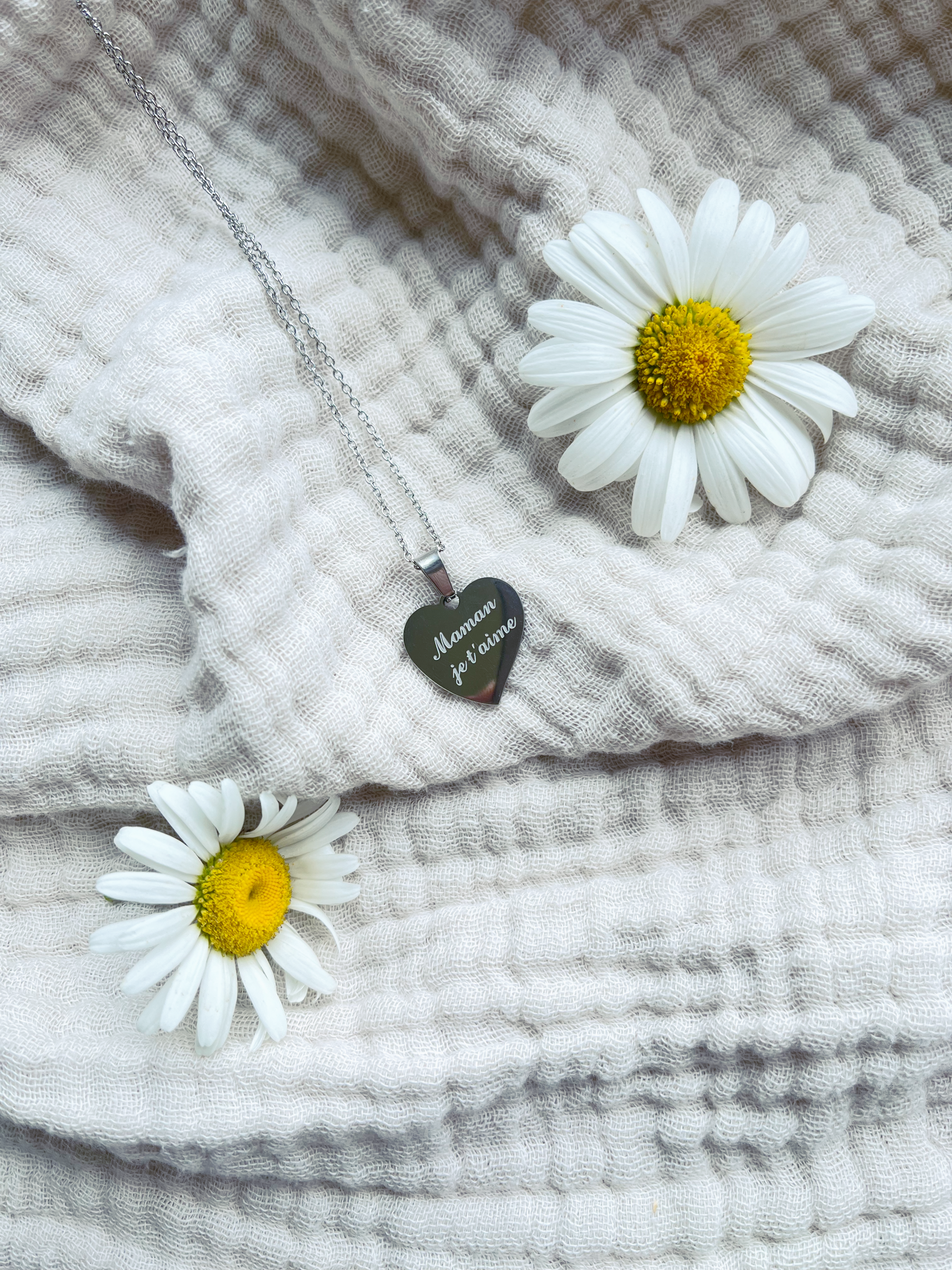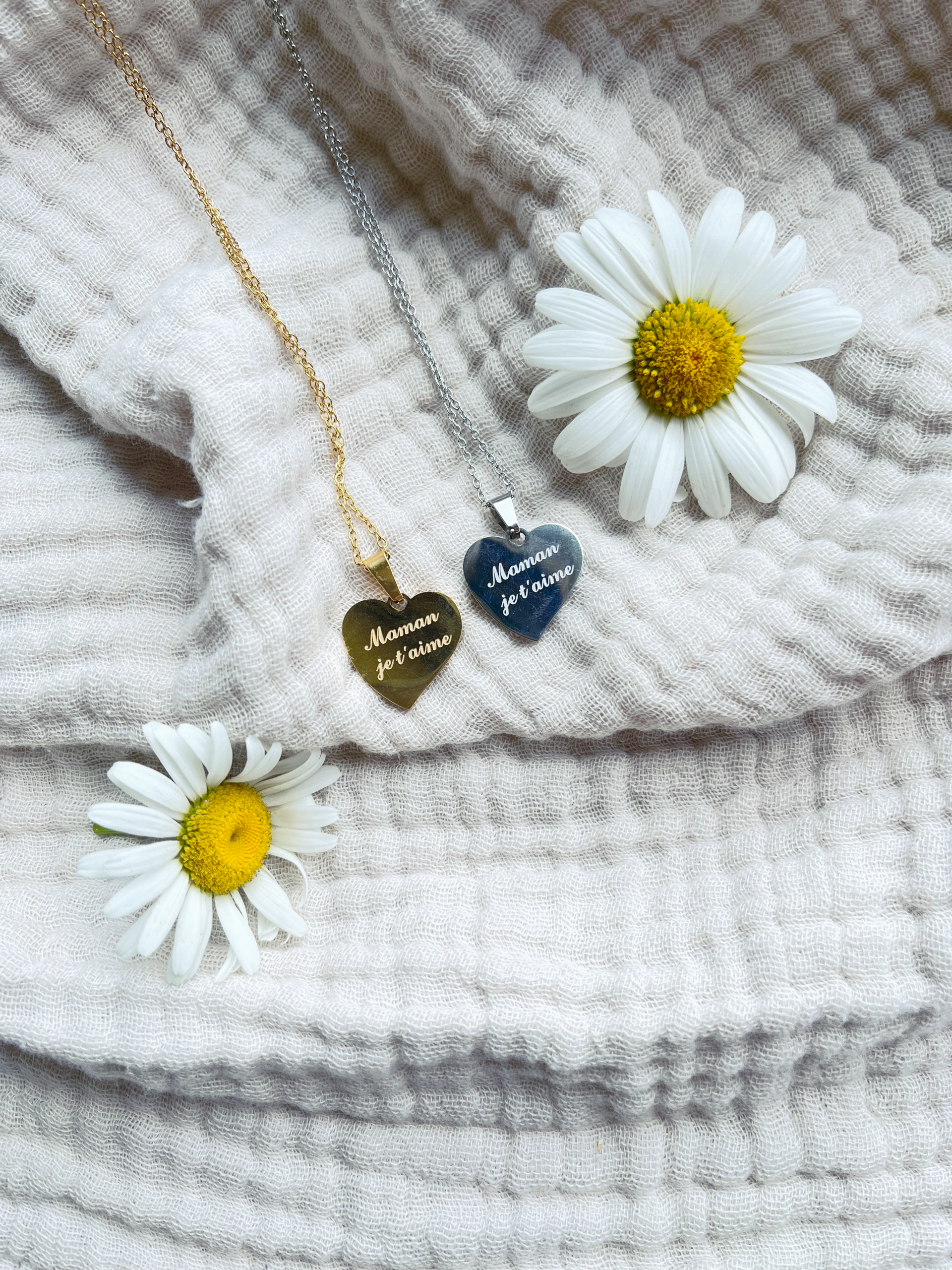 « Superbe collier en acier inoxydable à offrir à une maman incroyable que l’on aime très fort » Un collier très tendance et glamour que l’on peut porter à toutes les occasions ! Le plus de ce collier : la gravure des mots « maman je t’aime » sur le pendentif coeur en acier inoxydable. Sa finition étanche vous permettra de le porter tous les jours sans crainte ! Possibilité de trouver le bracelet en jonc identique au collier. Proposé en deux couleurs : Argent Plaqué or