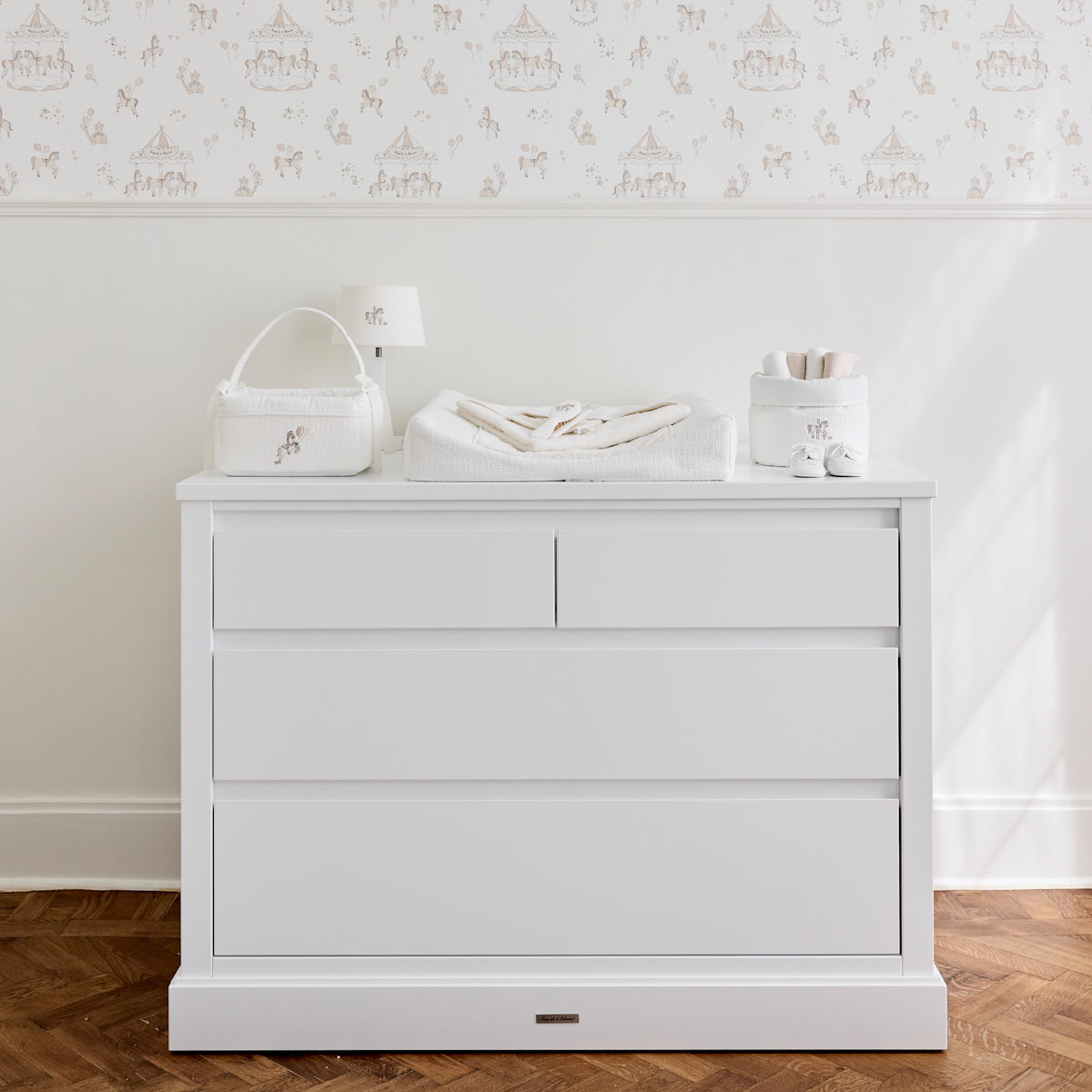 La commode Design est dotée de 4 tiroirs montés sur coulisses métalliques à freins hydrauliques permettant une fermeture progressive. Une rallonge se place à l’arrière de la commode afin de vous permettre de langer bébé face à vous. La profondeur du plateau passe alors de 56 à 71cm. Mobilier en matériaux MDF peinture blanche en conformité avec la norme EN 71-3. […]