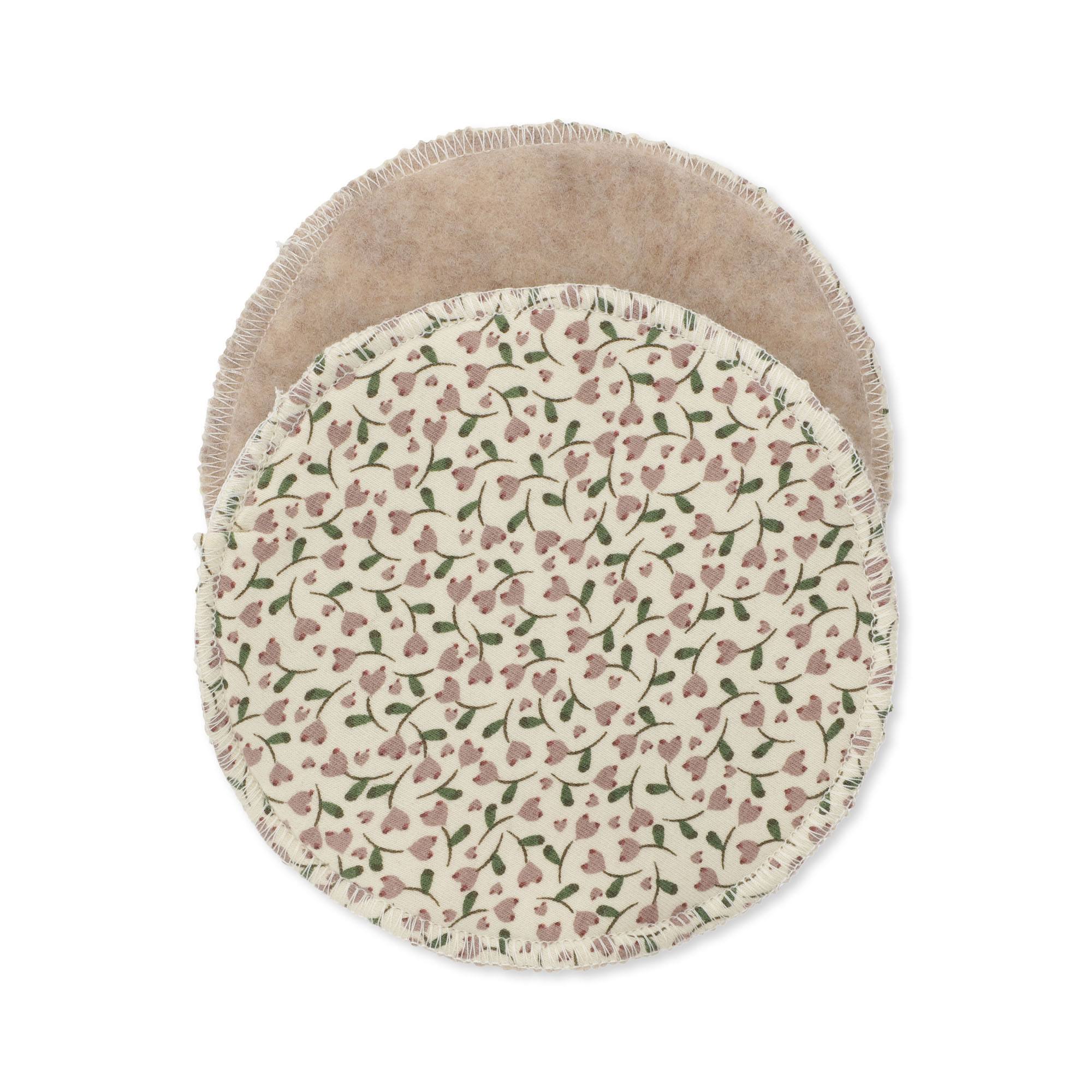 Coussinets d’allaitement fabriqués en 100% molleton laine avec un revers en coton imprimé.