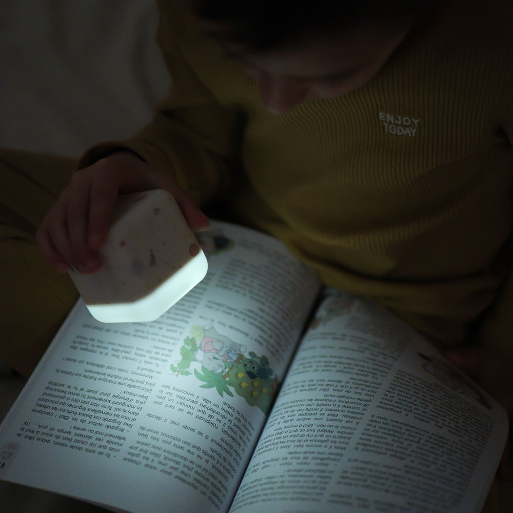 Cube B™ – Espace est une veilleuse pour les enfants au moment du coucher. Nomade et multifonction, elle émet une douce lueur pour rassurer tout au long de la nuit. Elle peut être utilisée seule ou branchée au mur grâce à son bloc en 2 parties qui, une fois assemblées, brillent ensemble pour créer un parfait cube lumineux. La veilleuse Cube B™ – Espace change de couleur et d’intensité de lumière grâce à son capteur tactile intuitif, simple d’utilisation. Branchée, elle émet une jolie lueur blanche réconfortante qui offre une ambiance apaisante dans la chambre. En utilisation nomade, elle diffuse une lumière blanche pour une ambiance douce puis d’un simple toucher, une lumière ambre réconfortante, plus ou moins intense. Cube B™ – Espace est le compagnon lumineux pour des nuits douces et paisibles pour les bébés et les enfants. Son format compact permet une prise en main facile pour les plus grands qui cherchent leur chemin dans l’obscurité sans réveiller leurs parents. Elle possède un minuteur qui permet de garantir une obscurité complète après l’endormissement. Cube B™ – Espace sur le sommeil des enfants avec tendresse et bienveillance. La veilleuse Cube B™ est fabriquée avec 30% de plastique recyclé et se recharge directement sur le secteur.
