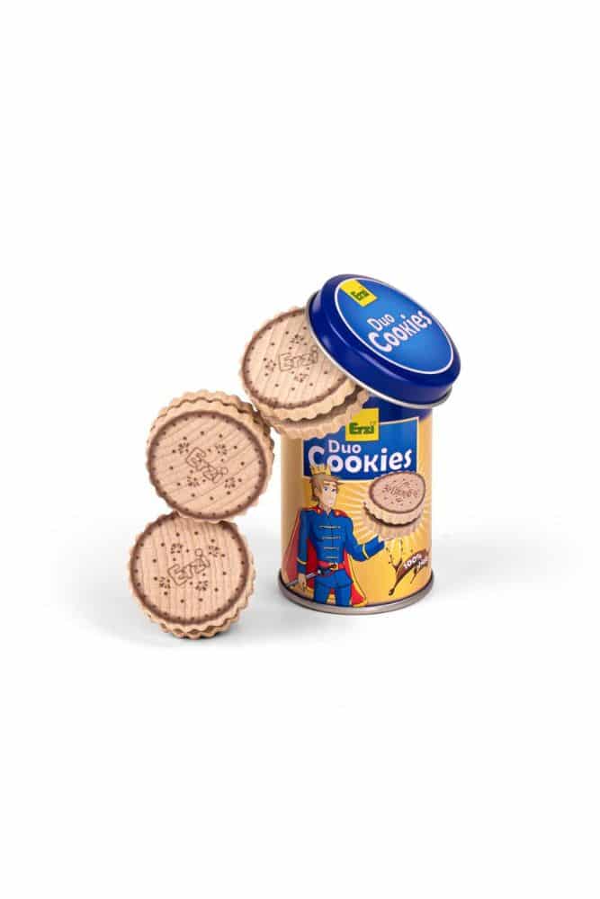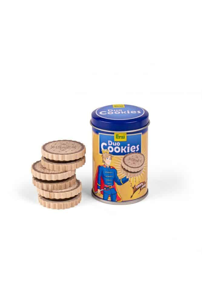 Découvrez cette jolie boîte en métal contenant 3 biscuits fourrés au chocolat en bois hyper réaliste. Idéal pour compléter un set de dinette pour enfant ou jouer au marchand.