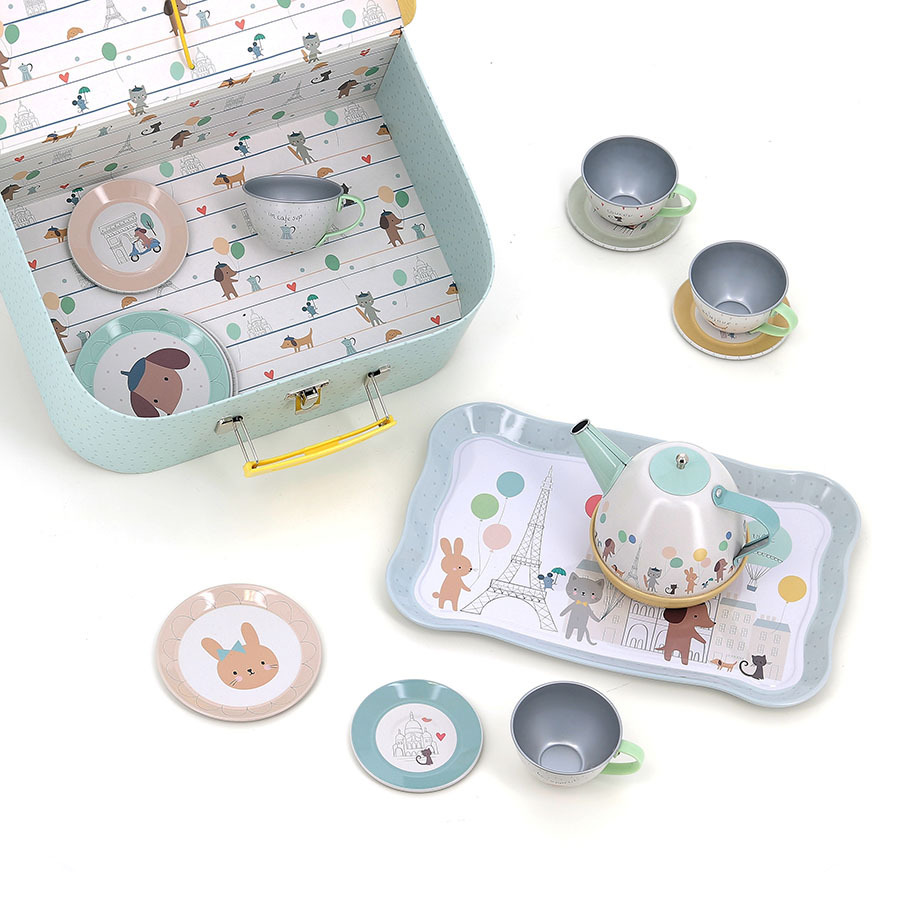 Vilac a conçu cette dinette musicale en métal tout en douceur et poésie, pour les enfants à partir de 3 ans. Une théière magique joue une douce mélodie quand on la penche pour servir le thé comme les grands.