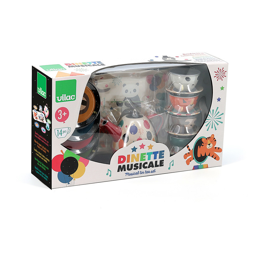 C’est l’heure du goûter ! Doudou, installe-toi ici, entre Poupée et Ours blanc. Je vais chercher papa et on sera au complet ! Au programme de ce goûter d’anniversaire, gonflage de ballons et numéros de cirque. Laissez parler votre gourmandise avec notre dînette métal musicale sur le thème Arc-en-ciel, illustrée avec poésie par l’illustrateur Andy WESTFACE.