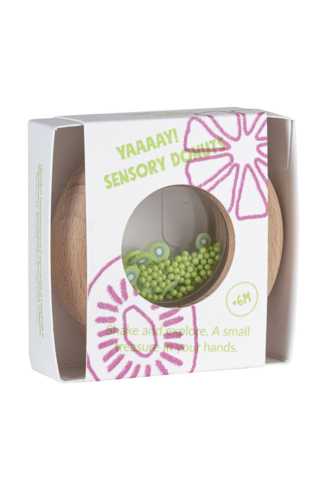 Avec le Donut Kiwis, bébé découvre le mouvement, le son et des contrastes verts très attractifs. L’objet roule, se saisit, se secoue : autant d’occasions de travailler la coordination et l’intention du geste. Observation : suivre les kiwis et repérer les couleurs Motricité : transfert main-à -main, roulades contrôlées Sons calmes pour des rituels d’éveil sereins Matériaux sûrs & mordillage OK