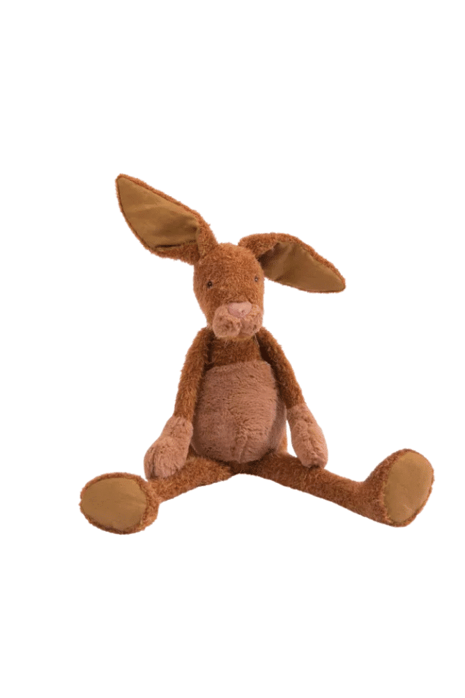 Grand lapin à la fourrure orange brique toute douce, avec semelles et oreilles en lin. Avec son corps moelleux et ses pattes souples, il accompagnera les tout-petits pendant de longues années, pour jouer, ou se câliner.