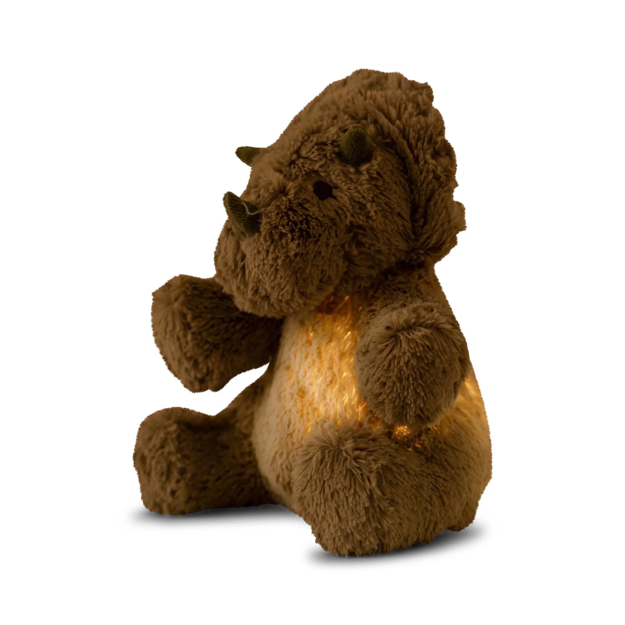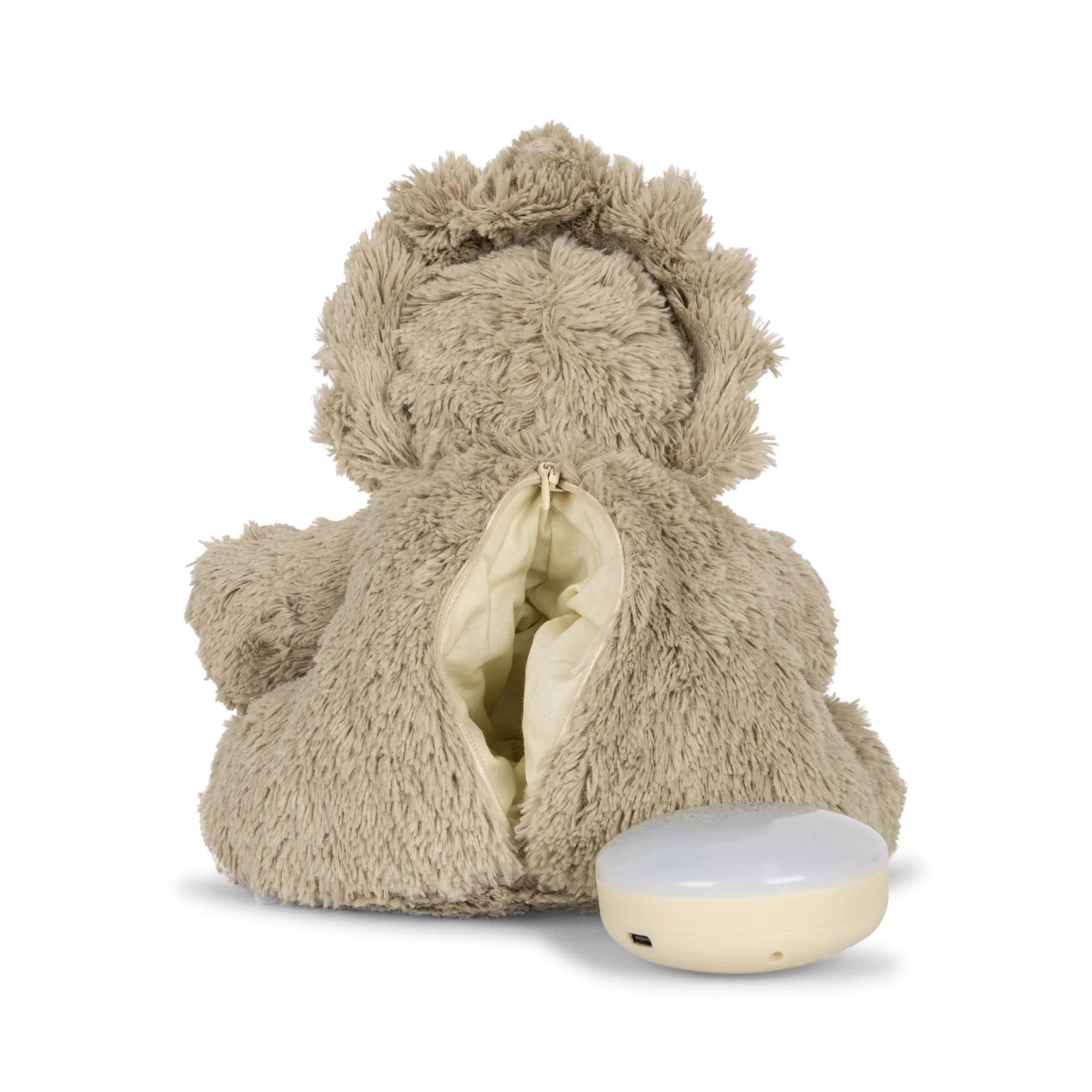 Veilleuse douce et douillette en polyester recyclé. La peluche produit un éclairage doux et une lueur apaisante. La lampe peluche est conçue avec un haut-parleur Bluetooth rechargeable intégré qui permet à vos enfants d’écouter des bruits blancs, des chansons, et du contenu comme des histoires pour s’endormir. La lumière LED est cachée à l’intérieur d’un compartiment fermé à l’aide d’une fermeture à glissière à l’arrière.