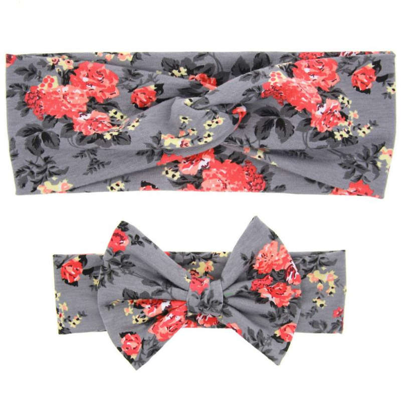 La mode ça se transmet de mère en fille! Lot de 2 bandeaux, un taille bébé ou fille et l’autre taille adulte. Turban en tissu gris avec fleurs roses. NÅ“ud sur le bandeau de Mademoiselle. composition : Polyester 94%, Élasthanne 6%