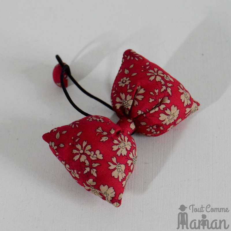 Voilà un accessoire parfait pour faire une petite star comme maman! Elastique avec nœud en tissu liberty rouge à motifs fleuris. Existe aussi en serre tête.